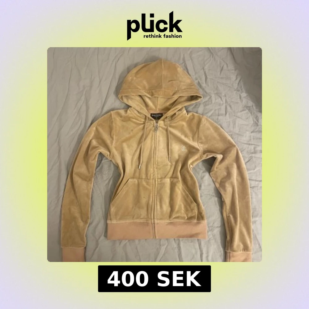 Säljer en snygg beige hoodie från Juicy Couture med dragkedja och huva. Den har en glittrig Juicy-logga på ryggen och en dekorativ dragkedja med ett J-hänge. Perfekt för en avslappnad stil.