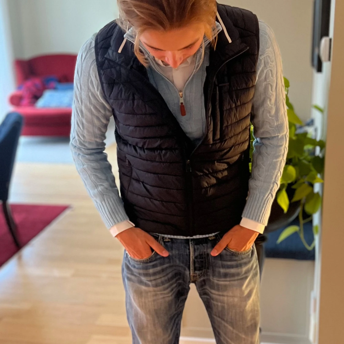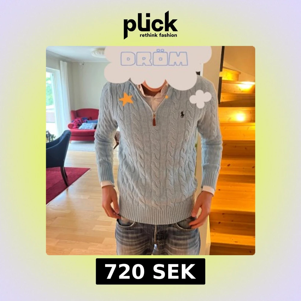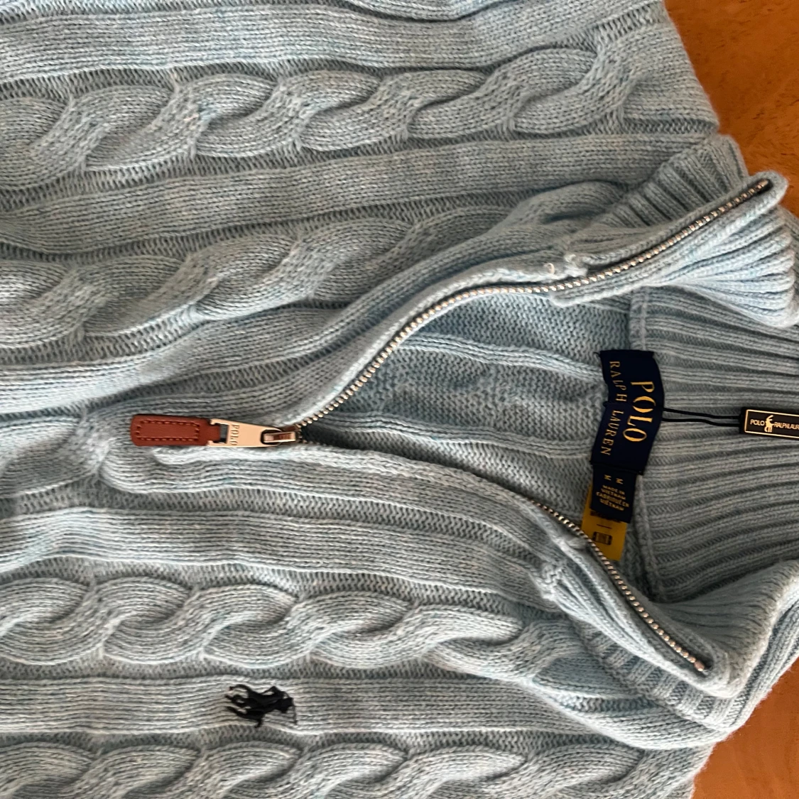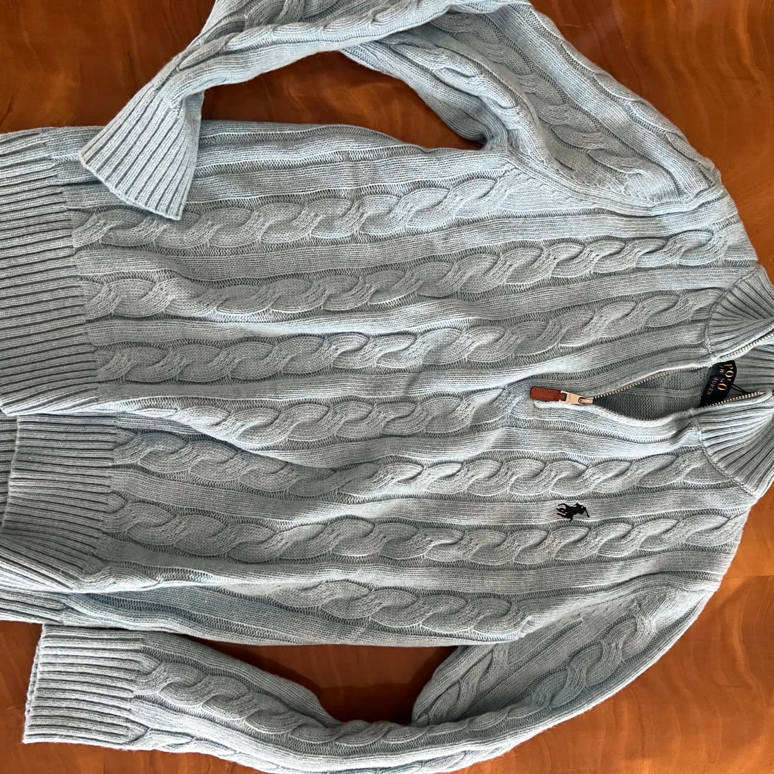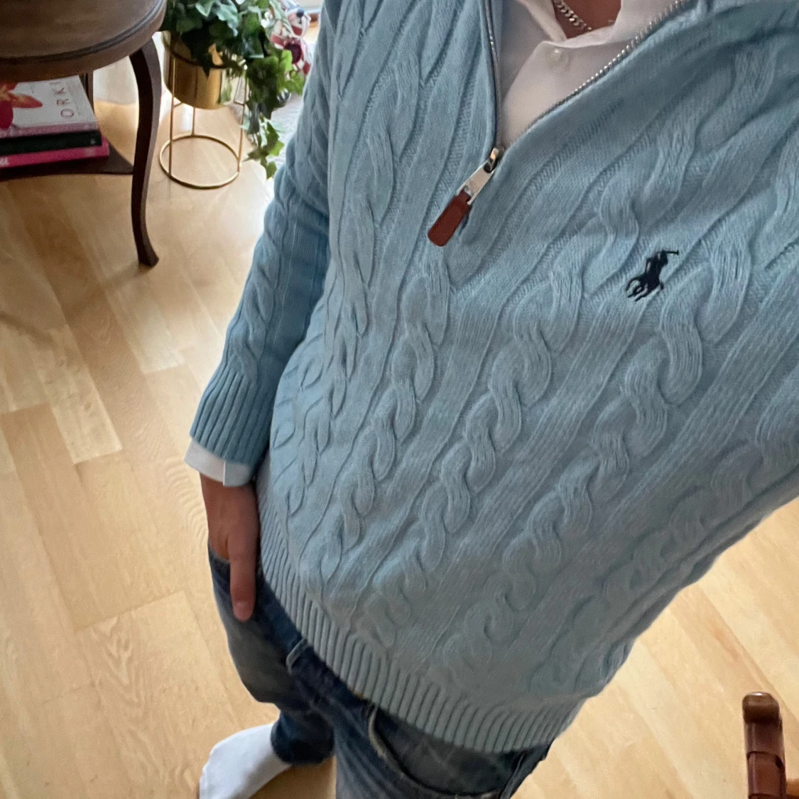 Säljer en ljusblå kabelstickad tröja från Polo Ralph Lauren med half zip och klassisk broderad logga på bröstet. Tröjan har lång ärm, ribbade muddar och hög krage. Perfekt för lager-på-lager och snygg till jeans.