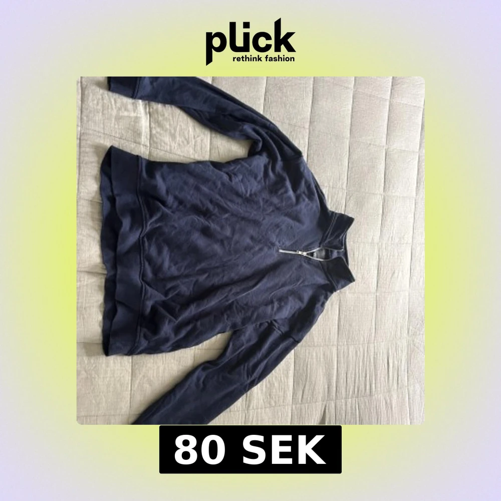 Mörkblå sweatshirt med half zip och hög krage. Tröjan har långa ärmar och ribbade muddar vid ärmslut och nederkant. Perfekt för lager-på-lager och chill dagar. Materialet känns mjukt och bekvämt, troligtvis bomull eller bomullsblandning..