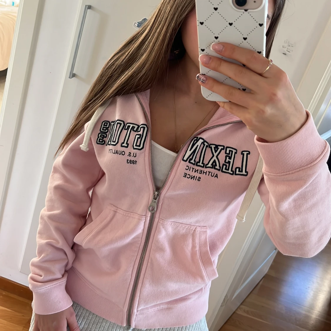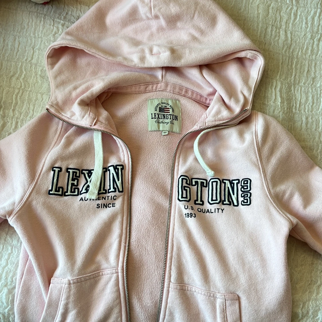 Superfin ljusrosa hoodie från Lexington med dragkedja, huva och vita snören. Stor Lexington-logga broderad framtill. Mjuk bomullskvalitet och kängurufickor.