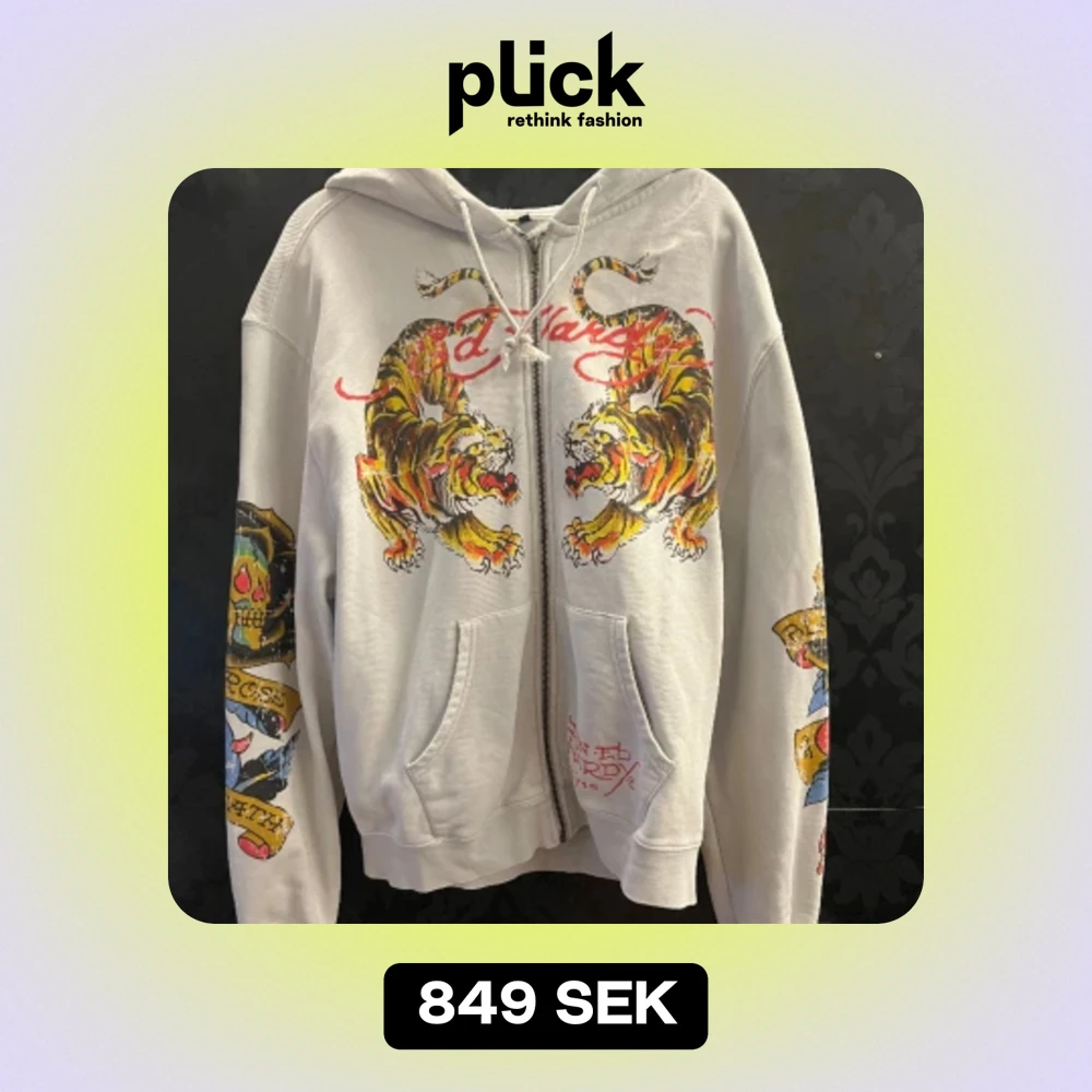 Ljusblå Ed Hardy zip hoodie med ballt tryck på. Tröjan köpt på Urban outfitters i London 2022 för 110£. Säljer på grund av att jag knappt använder tröjan längre. Den sitter ganska baggy , passar M & L. Skick 8/10. Skriv vid minsta fråga!