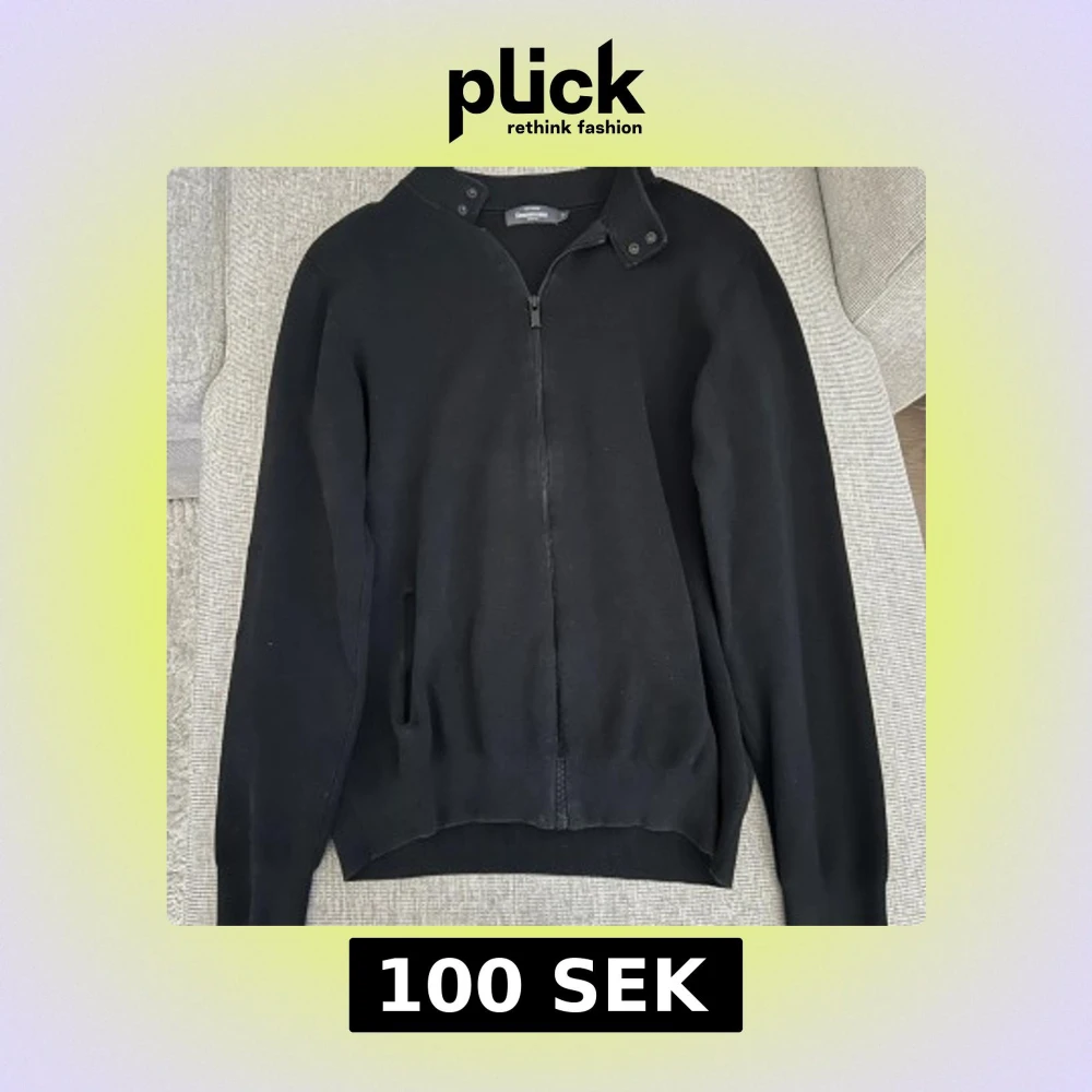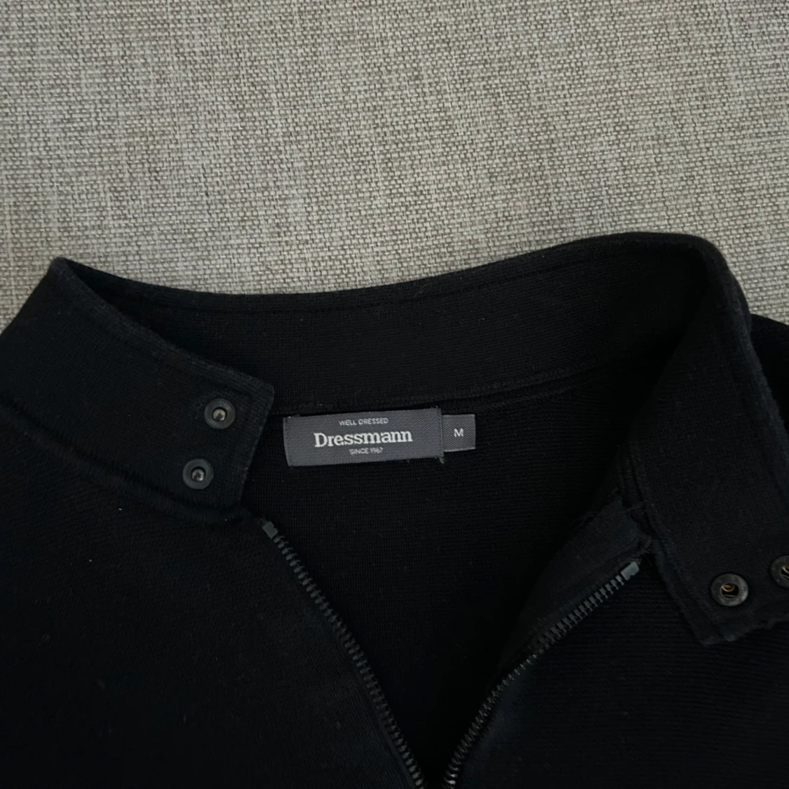 Säljer en stilren svart tröja från Dressmann med dragkedja och ståkrage. Perfekt för en avslappnad men ändå snygg look. Tröjan har långa ärmar och knappar vid kragen för extra detalj.