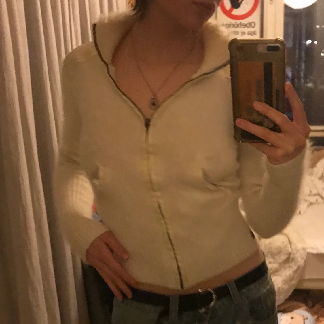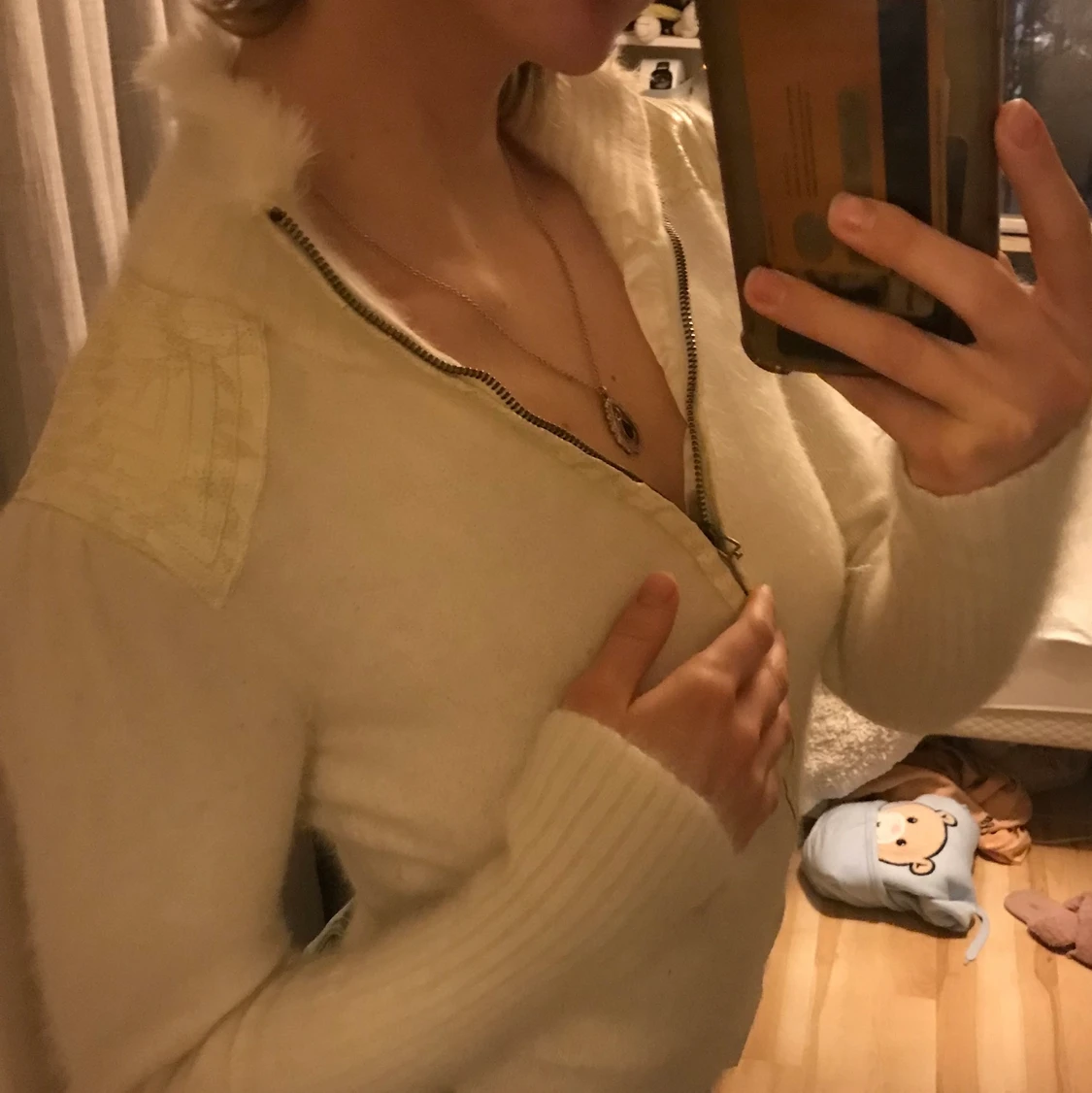 Tight zipup tröja med fina detaljer som en lurvig krage och saker på axlarna som syns på andra bilden. Har fickor på framsidan