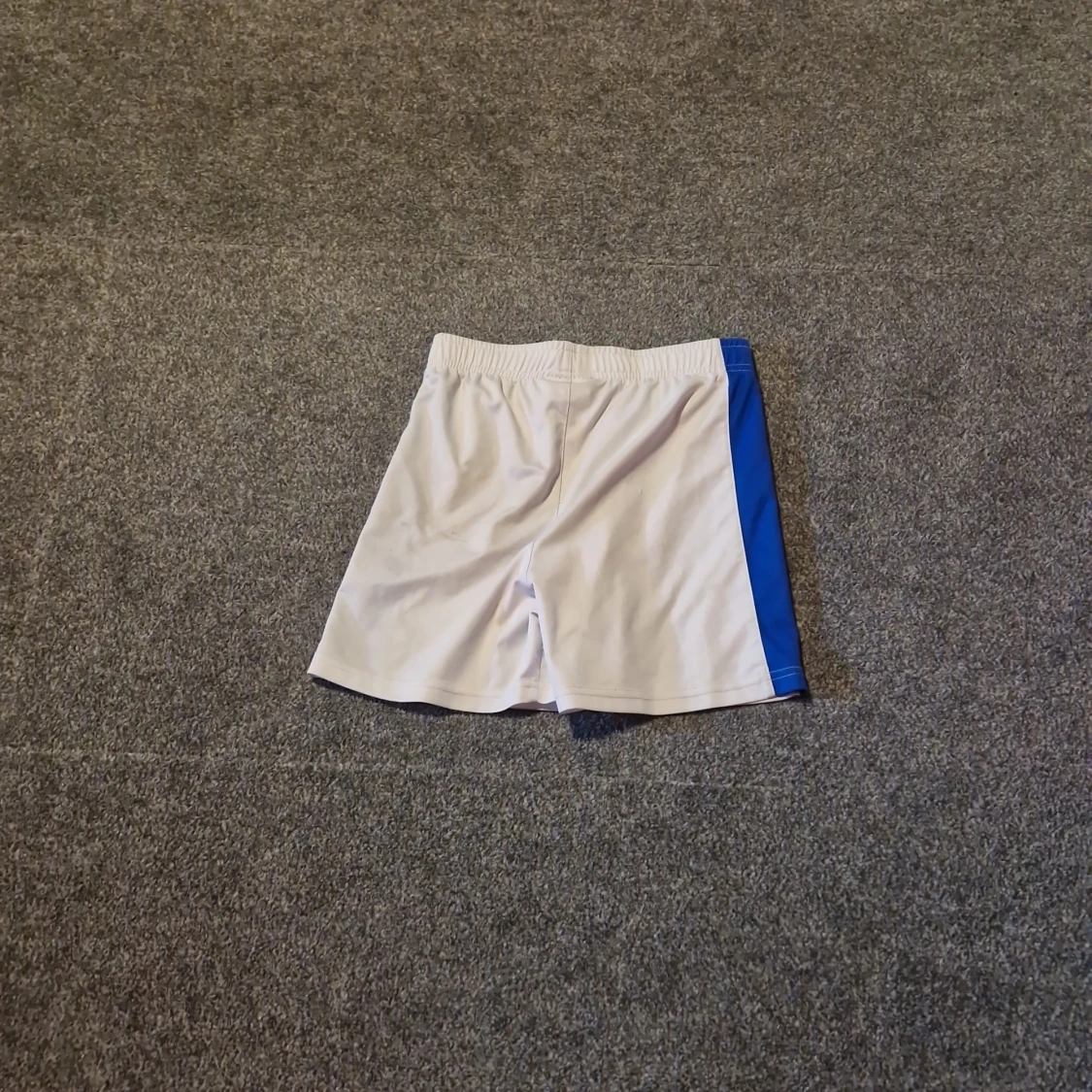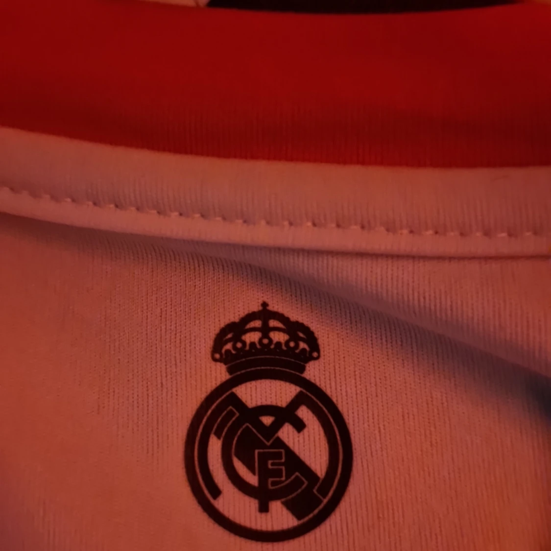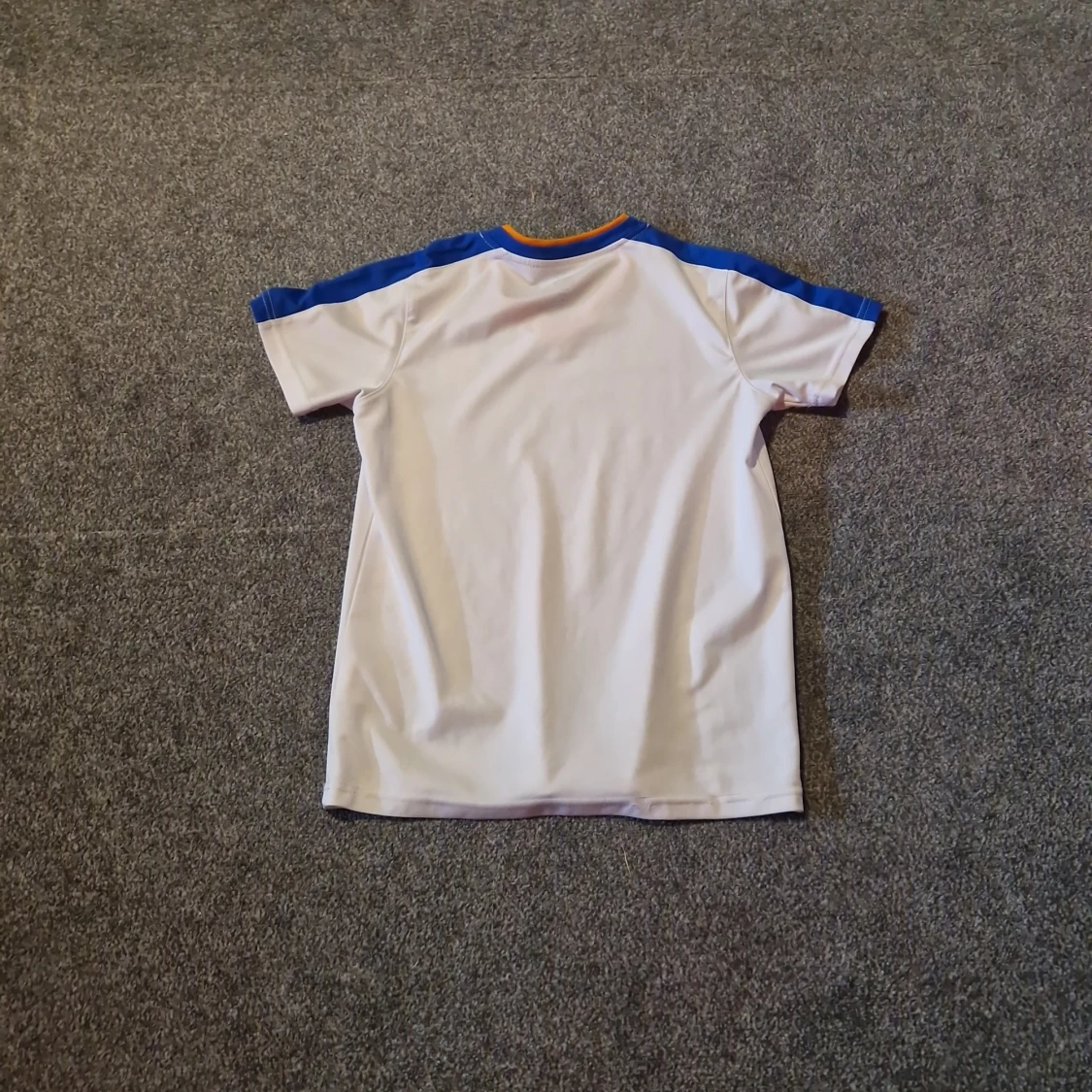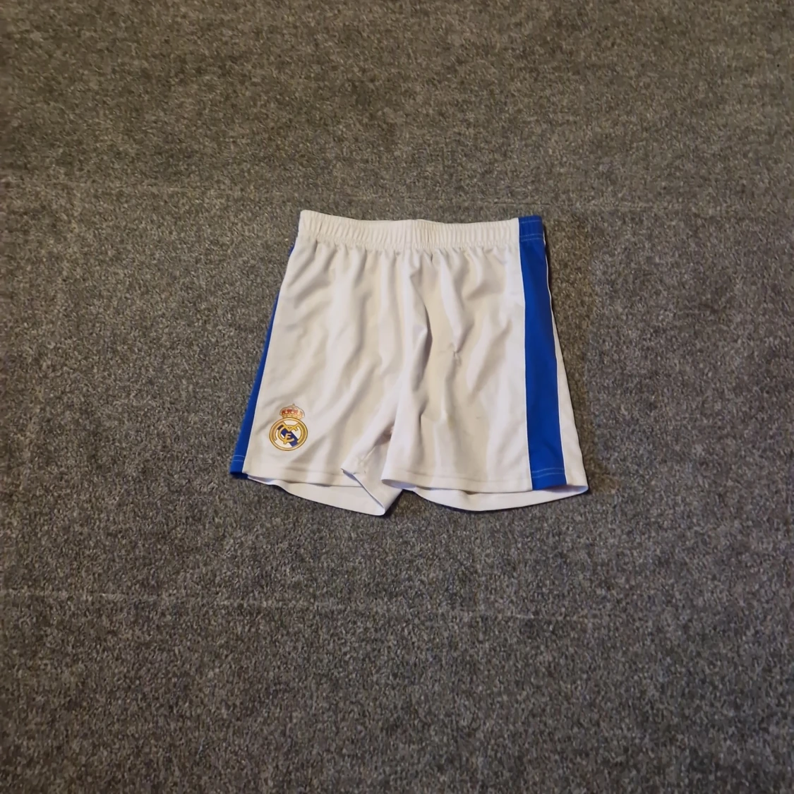 Säljer ett Real Madrid fotbollskit med vit kortärmad tröja och matchande shorts. Tröjan har blå och orange detaljer vid krage och axlar, samt klubbmärke och Real Madrid-tryck på bröstet. Shortsen har blå sidopanel och klubbmärke. Materialet är lätt och andas, perfekt för träning.