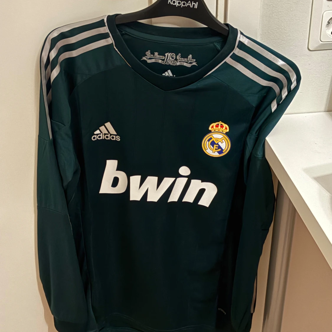 Säljer en mörkgrön långärmad Real Madrid-tröja från Adidas, jubileumsmodell 1902-2012. Tröjan har vita och silverfärgade detaljer, klassiska Adidas-ränder på axlarna och ClimaCool-material som andas. Real Madrid-emblem och Bwin-logga på bröstet.