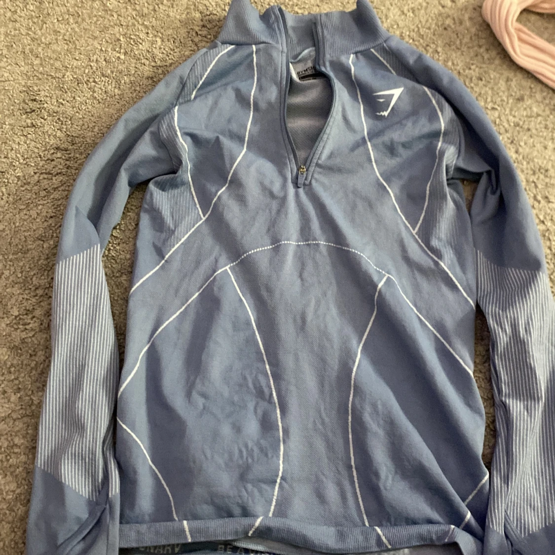 Säljer en blå långärmad tröja från Gymshark med dragkedja vid halsen och vita detaljer. Perfekt för träning eller en aktiv vardag. Tröjan har en praktisk ficka med dragkedja på ryggen.