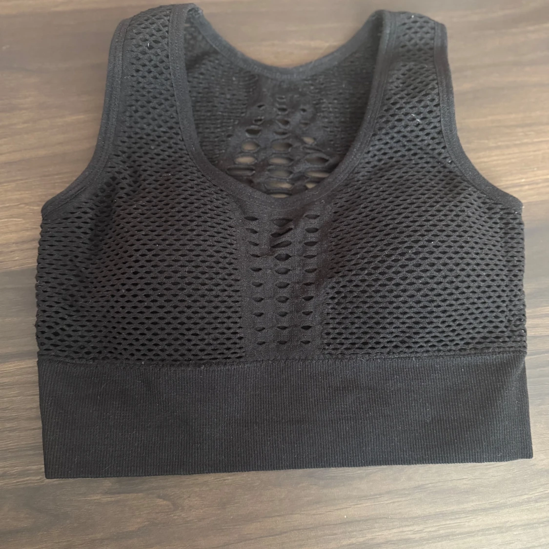 Säljer en svart sporttopp med nätmönster och breda axelband. Toppen har en tight passform och är perfekt för träning. Materialet är stretchigt och andas bra. Passar utmärkt för en aktiv livsstil. Använd några fåtals gånger