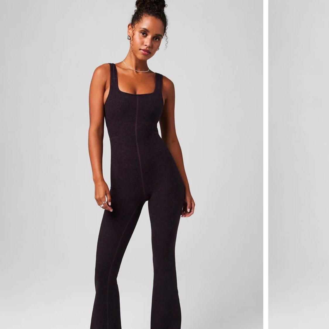 Supersnygg mörklila jumpsuit från Fabletics med utsvängda ben och breda axelband. Modellen heter Cozy Heather Kick Flare Jumpsuit och har fyrvägsstretch för extra komfort. Perfekt för dig som vill ha en trendig och bekväm look.