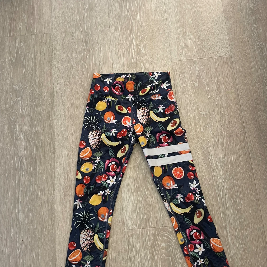 Säljer ett par supercoola leggings med ett färgglatt fruktmönster. De är svarta i grunden. Leggingsen har en hög midja och är tillverkade i ett stretchigt material som är perfekt för träning eller vardagsbruk. De har också två vita ränder på ena benet som en snygg detalj.