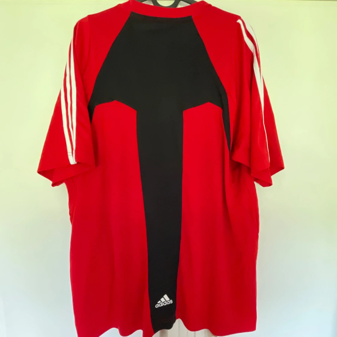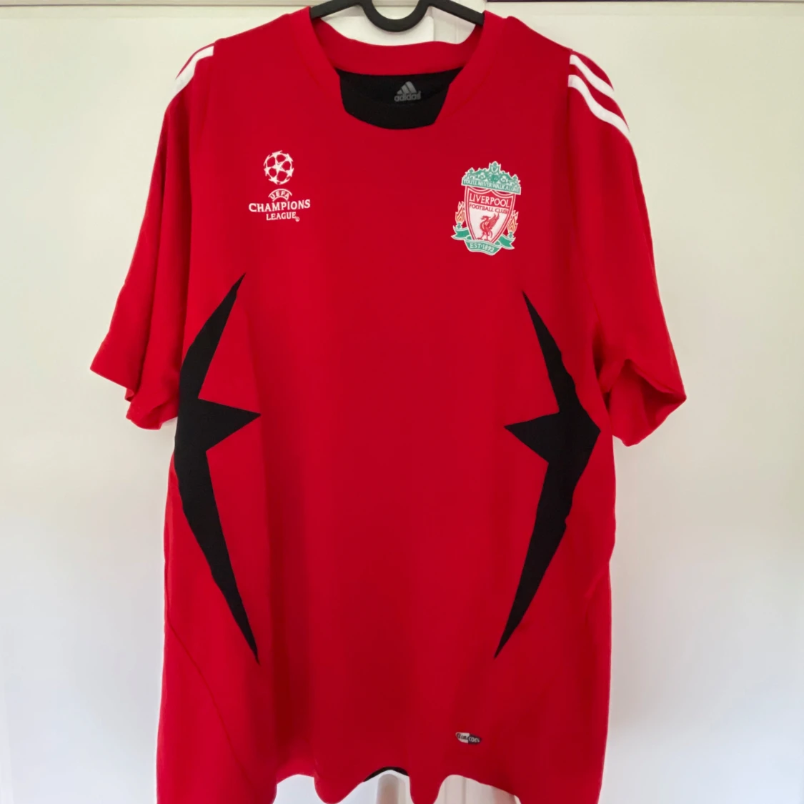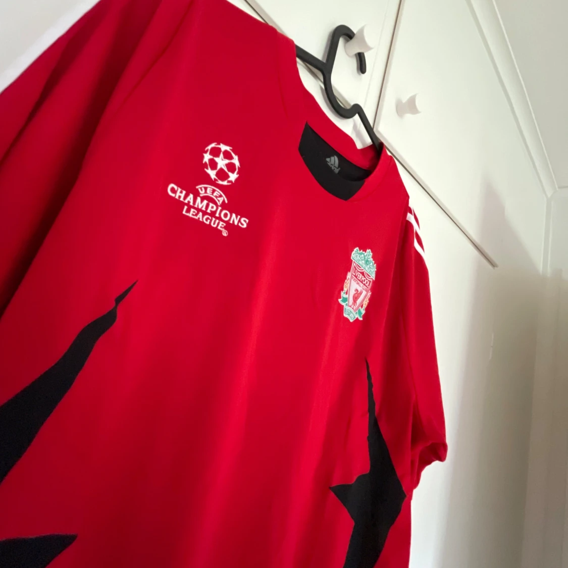 Röd Liverpool fotbollströja från Adidas med Champions League-logga och klubbmärke på bröstet. Svarta blixtformade detaljer på sidorna och svart panel på ryggen. Tre vita ränder på axlarna. Tillverkad i polyester, perfekt för dig som älskar fotboll och vill sticka ut.