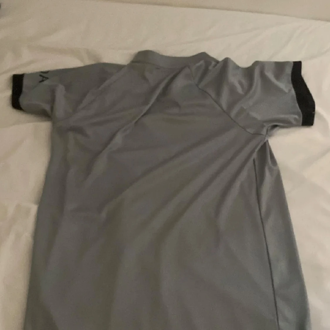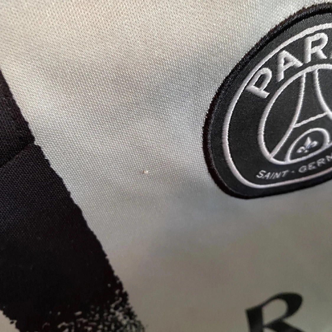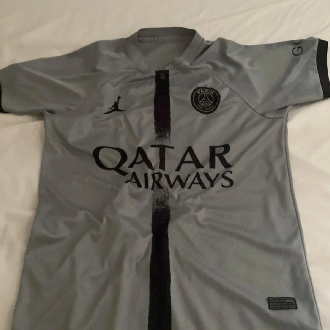 Snygg grå PSG fotbollströja med svart vertikal rand och Qatar Airways-logga på framsidan. Tröjan har korta ärmar med svarta detaljer och är tillverkad i ett lätt och bekvämt material. Perfekt för fotbollsfans! 7/10 skick. Anände den ganska lagom i sommaren