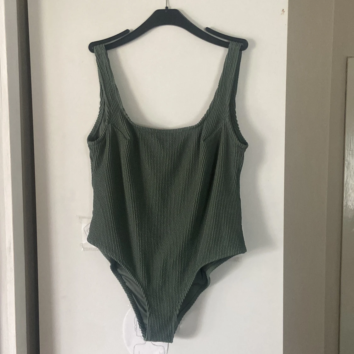 Snygg grön baddräkt från H&M i storlek 46. Modellen har breda axelband, fyrkantig ringning och ribbad struktur i tyget. Tillverkad i stretchig polyesterblandning för en bekväm passform. Perfekt för strand eller poolhäng!