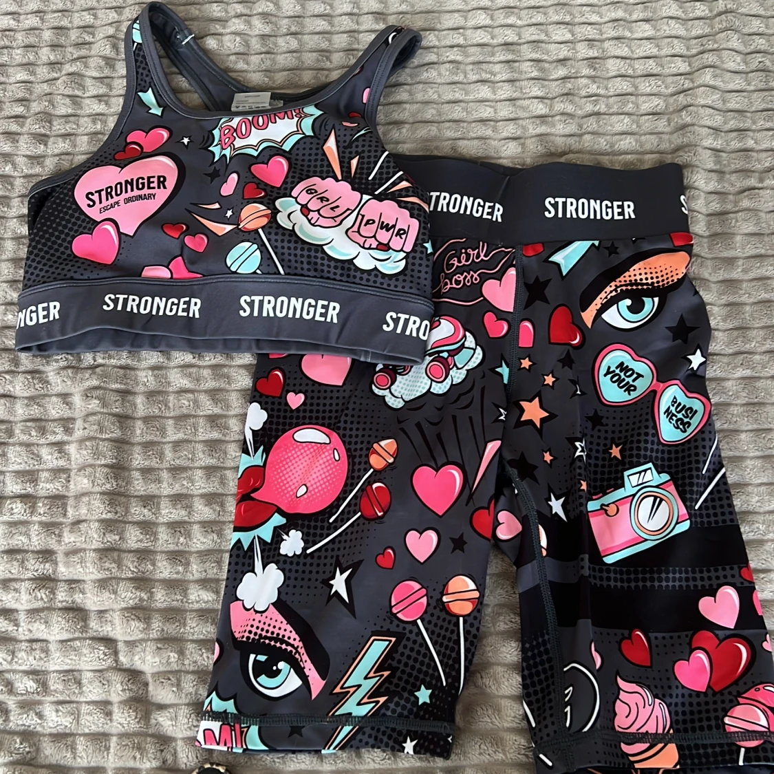 Säljer en färgglad sporttopp från Stronger med ett livligt mönster av hjärtan, planeter och text. Toppen har en tight passform och är ärmlös, perfekt för träning. Den har en bred resår med märkesloggan runtom.