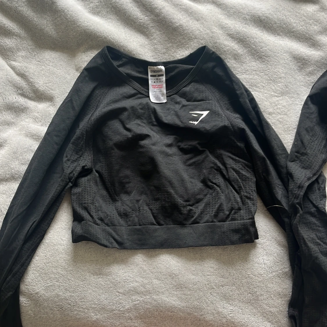 Säljer en eller två svarta croppade långärmade tröjor från Gymshark i storlek M. Tröjan har en tight passform, diskret Gymshark-logga på bröstet och är tillverkad i ett stretchigt material av nylon och elastan. Perfekt för träning och sportiga outfits. Säljer en för 145 och två för 245! En av dem har ett litet hål i armhålan som knappt syns, se bild. Köpte dem för 350kr/st.
