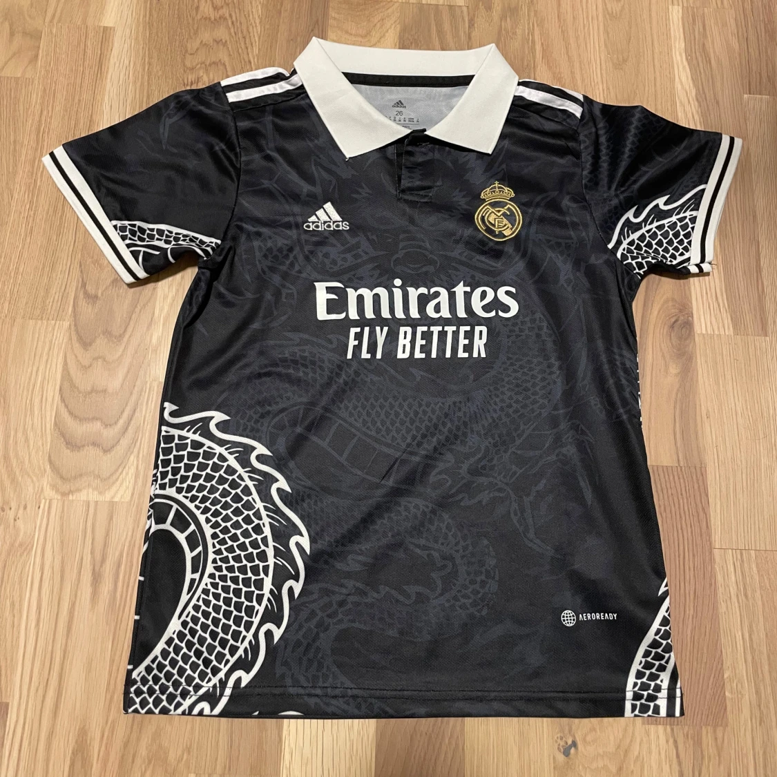 En fin och väldigt unik Real Madrid special tröja från 2023-2024 säsongen. Den är inte officiell, dock är den i väldigt gott skick, bara använd ett fåtal gånger. Tveka inte på att skicka ett meddelande om du har någon fråga! 😁 (Storleken nedan är barnstorlek)