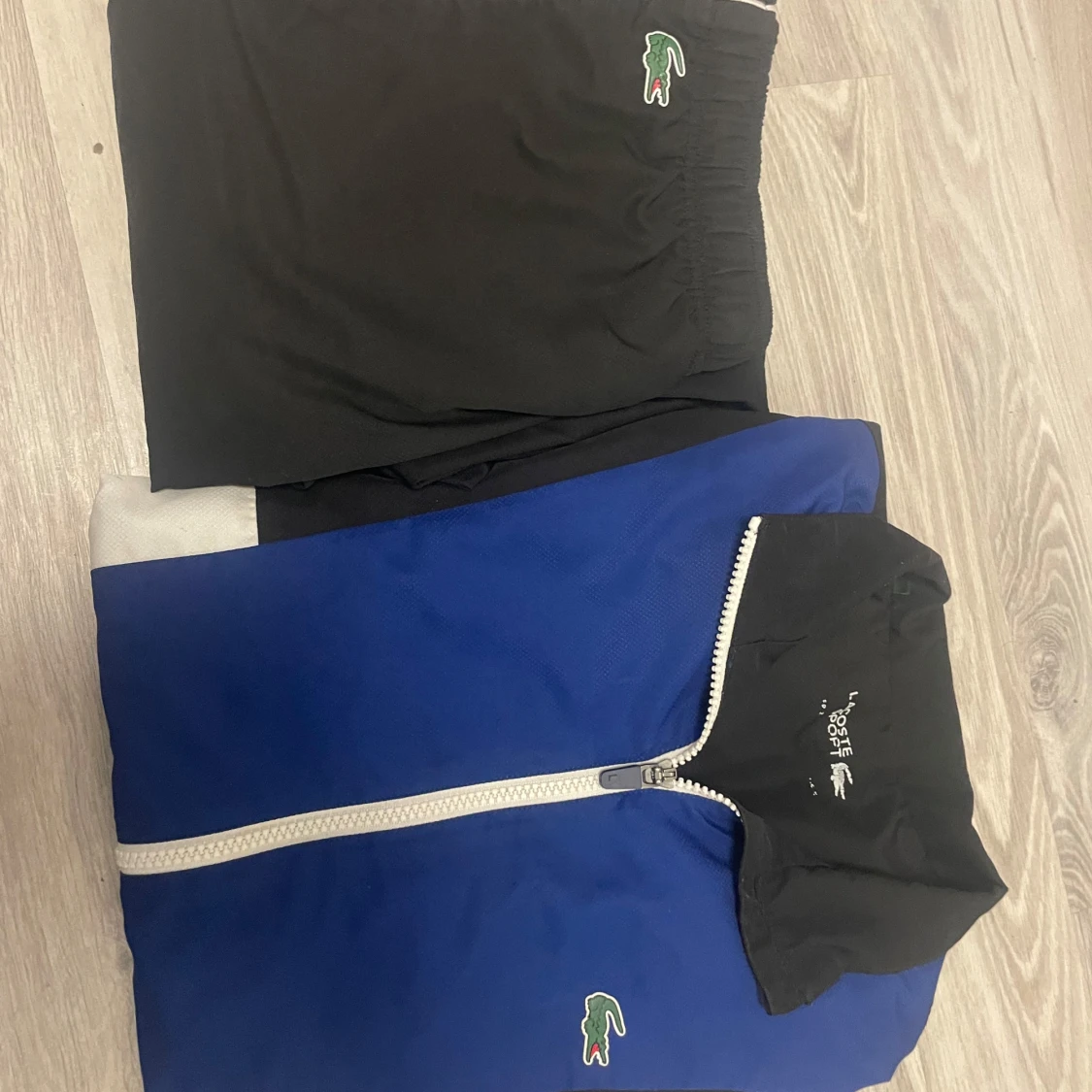 Ny och nypris kostar 3500kr Säljer en snygg tracksuit från Lacoste med jacka och byxa i svart och blått. Jackan har vit dragkedja, ståkrage och klassisk Lacoste-logga på bröstet. Byxorna är svarta med elastisk midja och liten krokodillogga. Perfekt för sport eller chill.