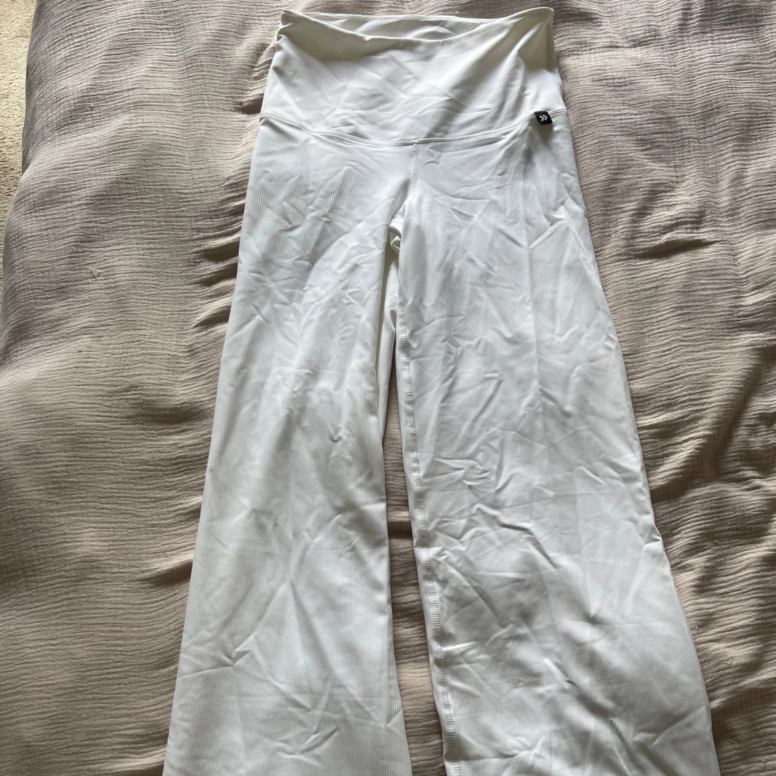 Säljer ett par vita ribbade byxor med hög midja och vida ben. Byxorna är stretchiga och ribbade till för träning och passar perfekt för mig som är 175cm!🤍🤍🤍Aldrig använda från lager 157