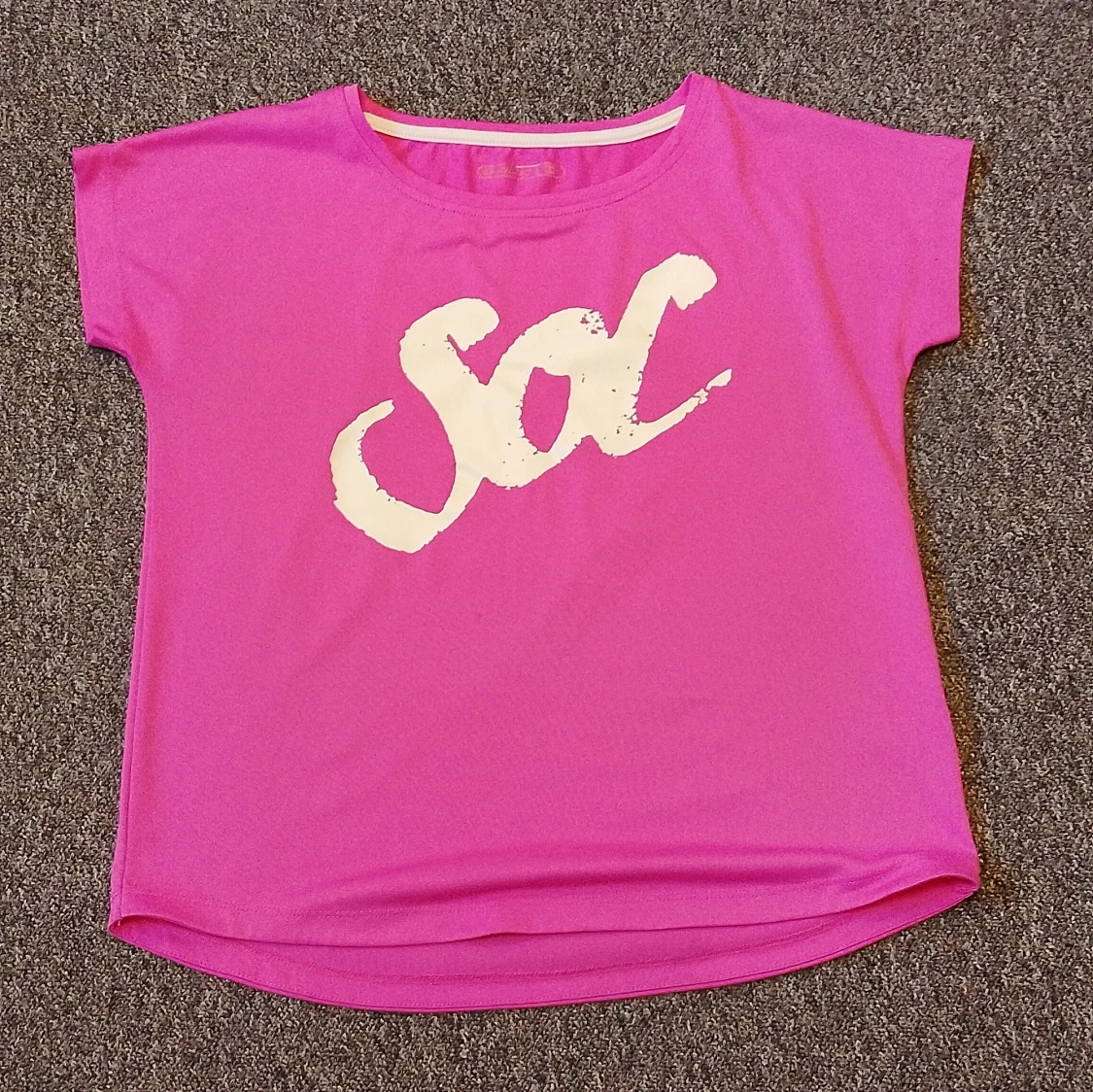 Snygg rosa topp från SOC med vit tryckt text 'SOC' på framsidan. Modellen är loose fit med rund hals och korta ärmar. Perfekt för träning eller chill dagar. Materialet är mjukt och lätt polyester som andas bra. Tvättas innan jag skickar om du vill😄