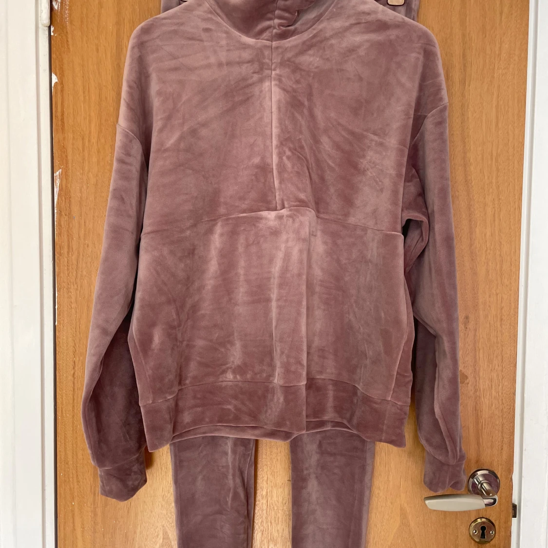 Supersköna mjukisbyxor och tröja i en mjuk och lyxig velourkänsla. Byxorna är i en dämpad mauve/rosa nyans och har en tight passform med hög midja. Perfekta för chill eller myskvällar hemma. Byxor i M pch tröja i S