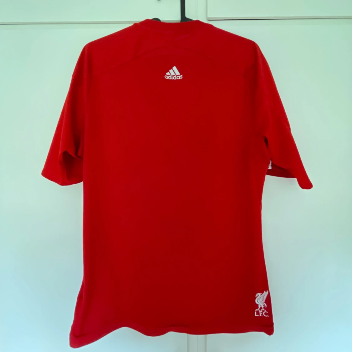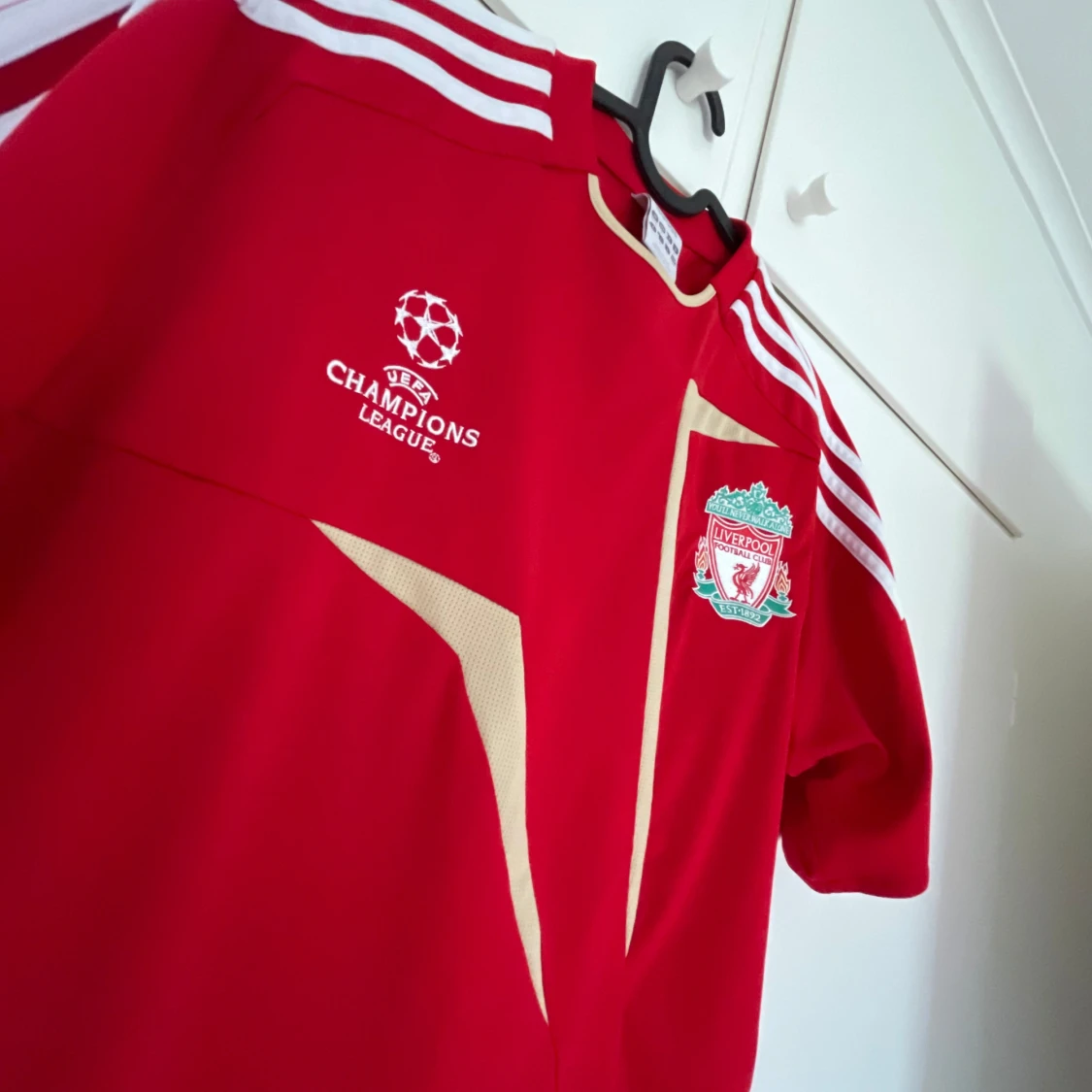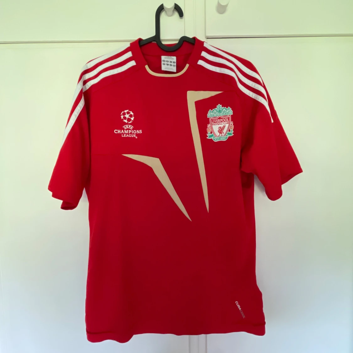 Röd Liverpool fotbollströja från Adidas med Champions League-logga och klubbmärke på bröstet. Tröjan har vita detaljer, guldiga grafiska inslag och klassiska Adidas-ränder på axlarna. Tillverkad i lätt och ventilerande material, perfekt för match eller träning.
