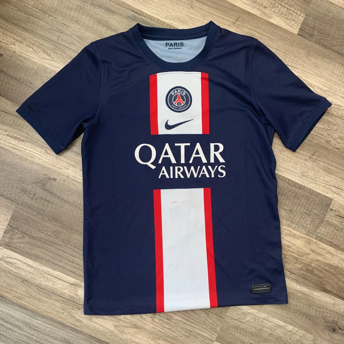 Säljer en PSG tröja i barnstorlek L(140-160) skulle jag säga. Det är i ganska illa skick men är äkta. Fläcken syns på bild 4, det finns lite problem med tyget här och där som syns på bilderna igen.
