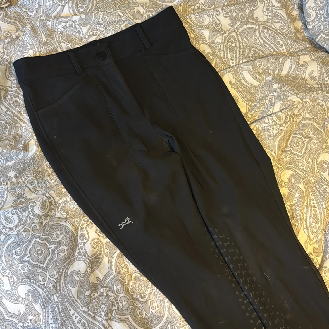 Snygga svarta ridbyxor från Fager med hög midja och halvskoning. Byxorna har en knapp och dragkedja framtill samt praktiska fickor för mobilen på båda benen. Endast använda ett fåtal gånger. Storlek 38 och modell Freya Hybrid. Nypris: 1299kr