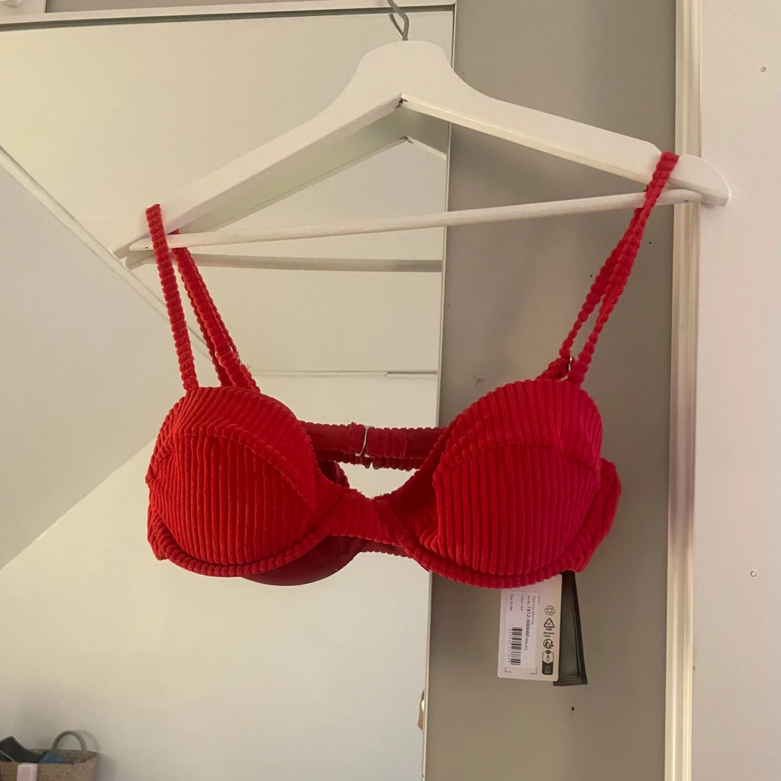 Snygg röd bikini från NA-KD med ribbad textur. Överdelen har vadderade kupor och justerbara axelband för perfekt passform. Underdelen är i en klassisk modell som matchar toppen. Storleken i överdelen är 80C och underdelen är storlek M