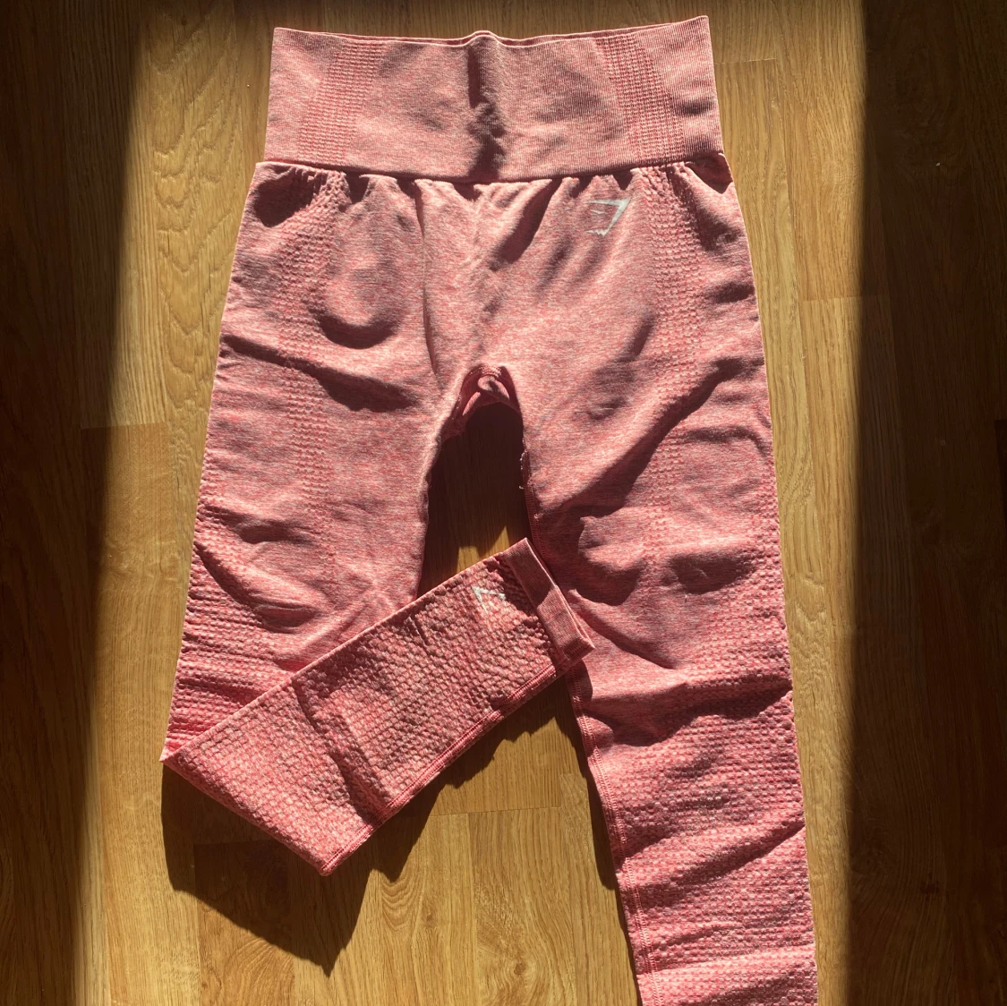 Säljer ett par snygga rosa leggings från Gymshark i storlek S. De har en hög midja och coolt strukturerat mönster längs benen. Diskret Gymshark-logga på höften och benet men de är lite spruckna som stns på bilderna. Inga andra större defekter. Hör av er vid frågor!💕