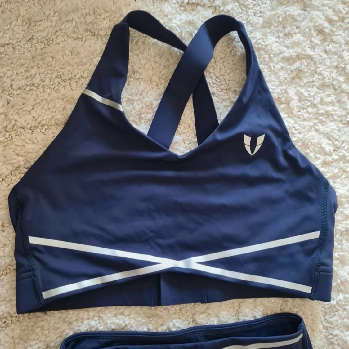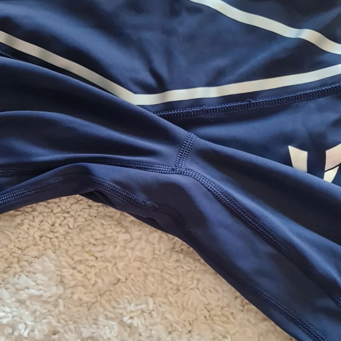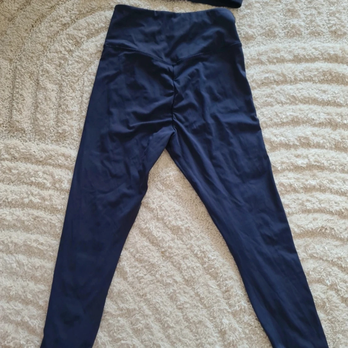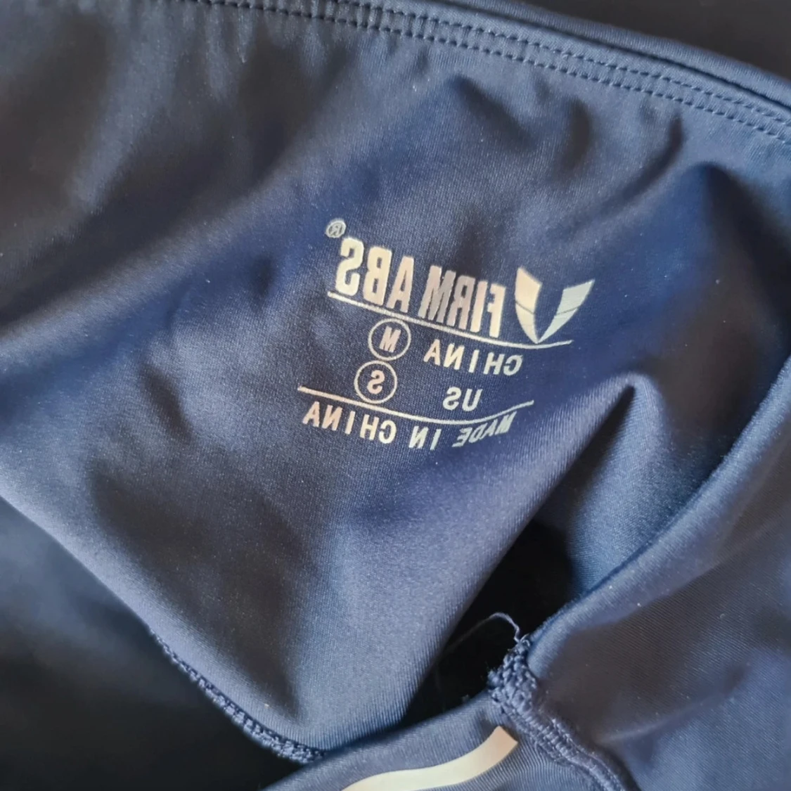 Snygga mörkblå leggings från Firm Abs med hög midja och vita detaljer i form av korsande linjer framtill. Materialet är stretchigt och passar perfekt för träning. Tight passform som framhäver benen och sitter skönt under hela passet. Storlek small och lite små I storleken. Inget att anmärka på. Nypris 1400 kr så kommer inte acceptera några bud, priset är redan toppen.