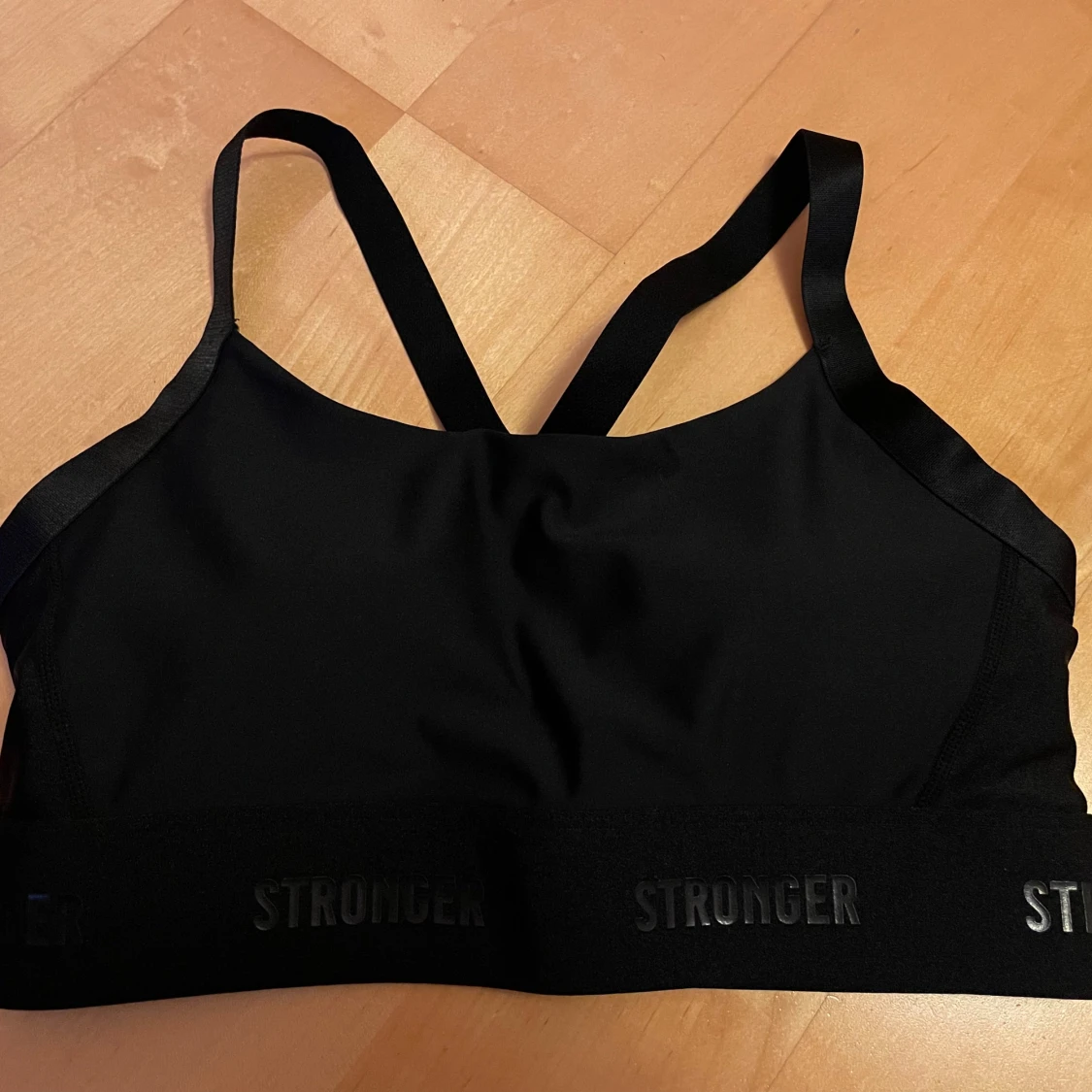 Svart sporttopp från Stronger, strl S. Justerbara axelband som korsas i ryggen. Brett resårband nedertill med logotypen 'STRONGER'. Helt ny.