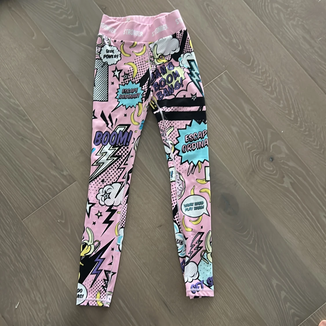 Färgglada tights från Stronger med tryck i rosa, blått, svart och gult. Hög midja med logotyp i midjeresåren. Materialet är stretchigt och passar perfekt för träning. Snygga detaljer med text och serietidningsgrafik över hela byxan.