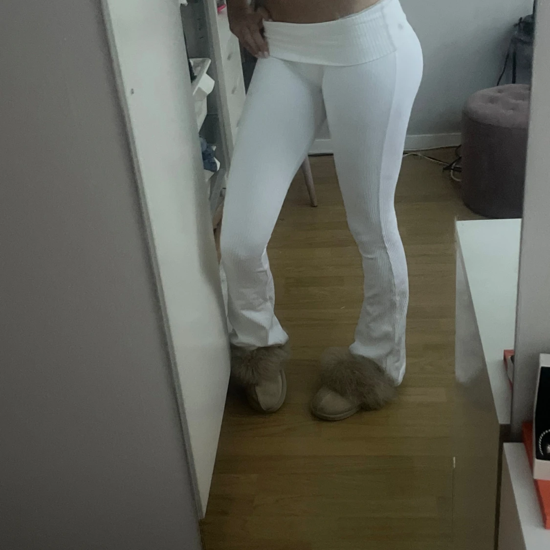 Nypris 699kr. OANVÄNDA, endast testade. Säljer ett par vita ribbade byxor med utsvängda ben och låg midja. Byxorna har en tight passform upptill och är tillverkade i ett stretchigt material som sitter snyggt på kroppen. Perfekta för en trendig och avslappnad look.