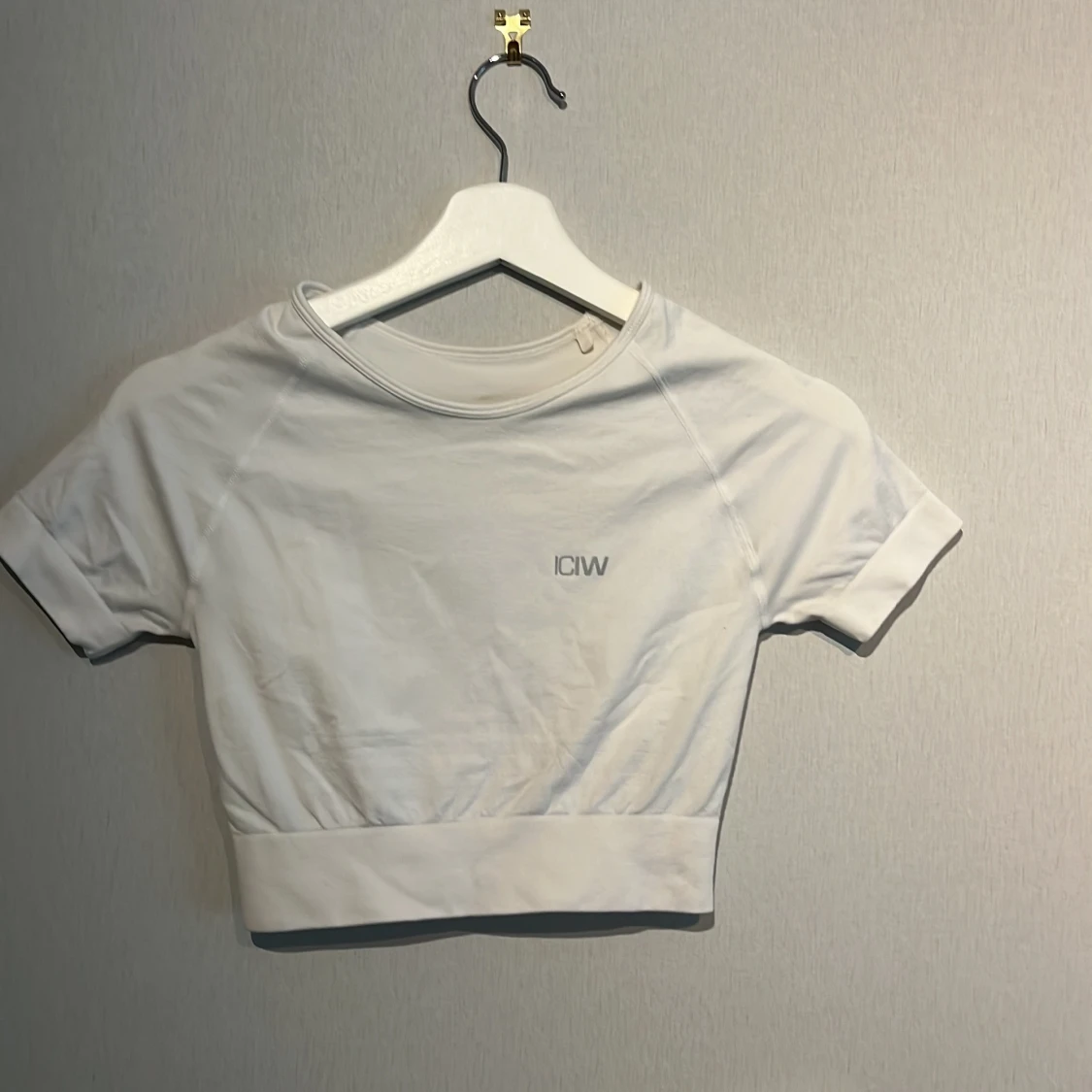 Vit croppadtränings topp från ICANIWILL med korta ärmar och rund hals. Toppen har en bred ribbad kant nedtill och diskret logga framtill. Mjukt och stretchigt material!