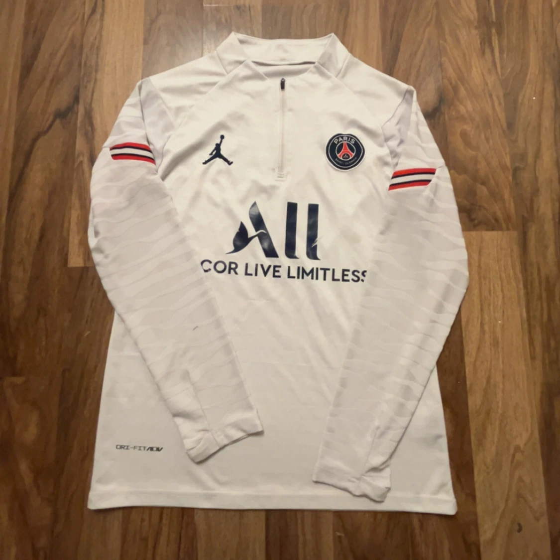Säljer en vit långärmad Paris Saint-Germain fotbollströja med halv dragkedja. Funkar perfekt att ha på sig när man tränar men även för att bara ha på sig, tunn men håller värmen bra och i väldigt bra skick, kommer i en nike påse. Inga fläckar!!