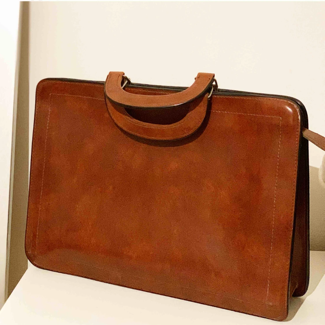 Snygg väska perfekt för dator i brun skinn imitation. Köpt på secondhand.
