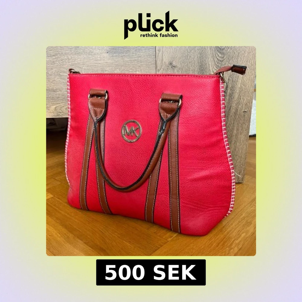 Snygg röd axelväska från Michael Kors med bruna handtag och dekorativa sömmar längs sidorna. Väskan har MK-logga i guld framtill och är tillverkad i skinnimitation. Perfekt storlek för att få plats med allt du behöver till vardagen.