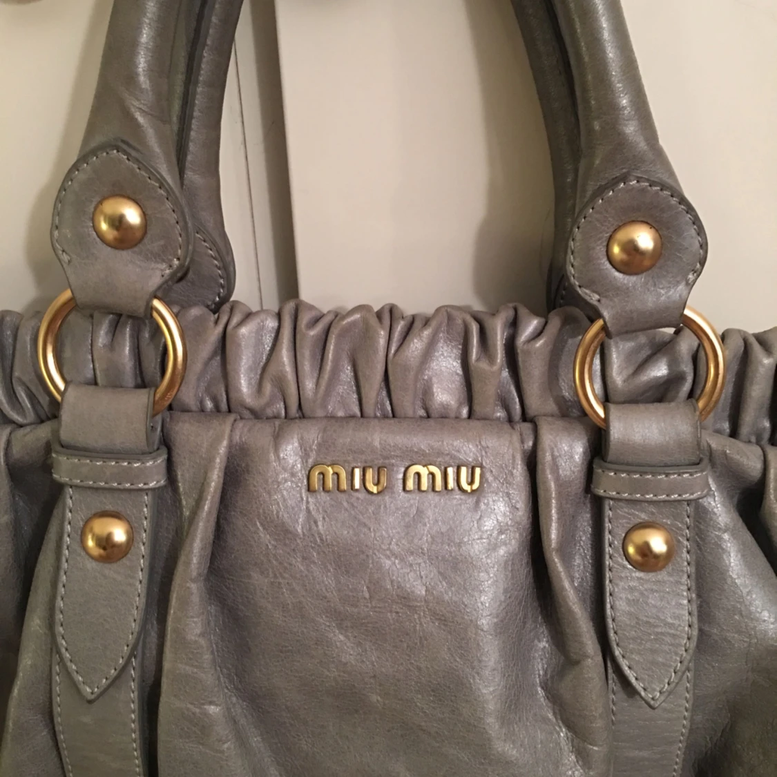 Miu miu väska i blågrå färg. Köptes begagnat för 5500 kr. Säljer den oerhört billigt för att väskan inte används. Har ett hål i innerfickan men ingenting som man märker av. Vid intresse kan jag ta fler bilder. Möts i sthlm,huddinge.