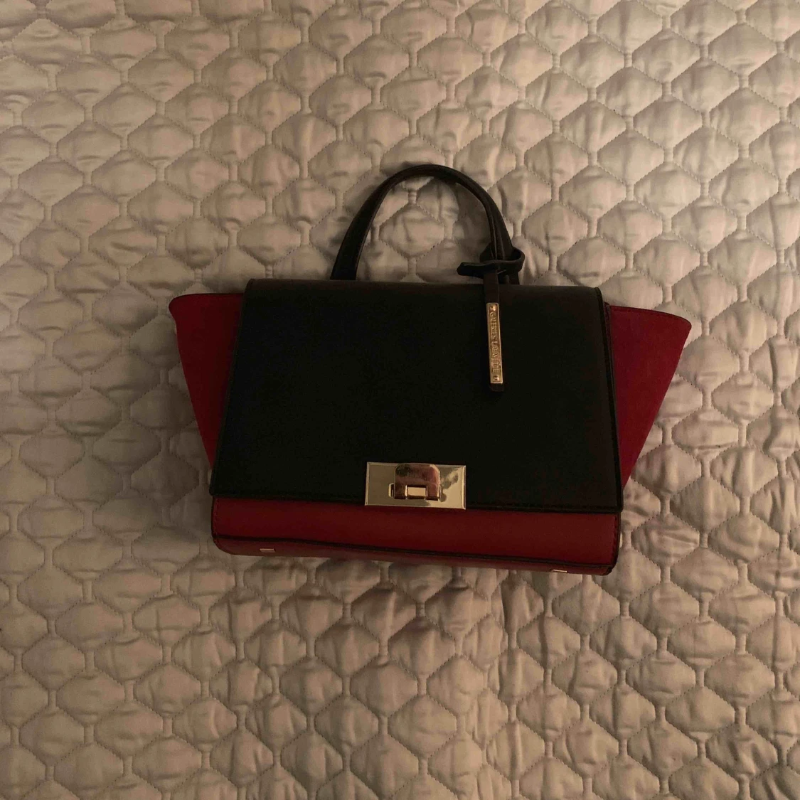 liten Svart och röd väska med guld detaljer. Mocka imitation på sidorna. Inköpt i Paris från lafayette. Axelrem medföljer.