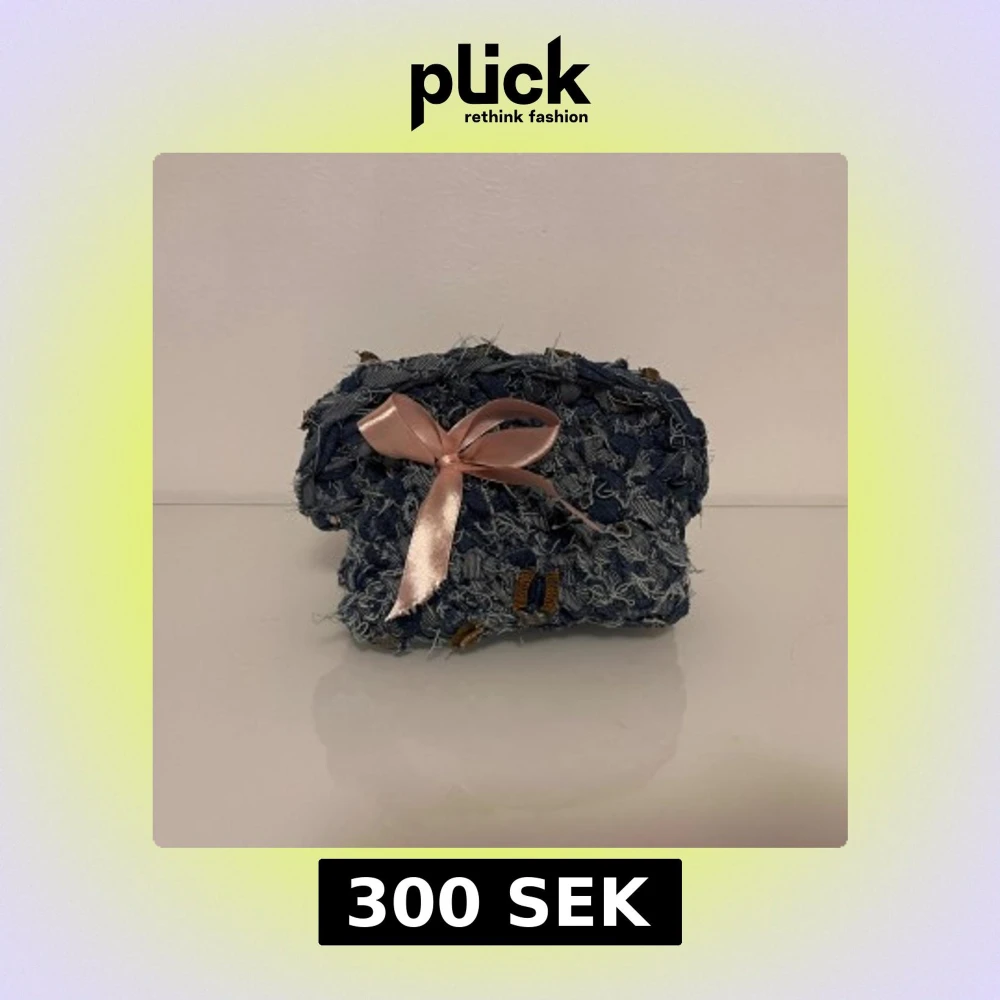 Unik virkad handväska i blått denimtyg med fransig struktur och detaljer i brunt. Väskan har en söt rosa satinrosett framtill och en mjuk, rundad form. Perfekt för dig som gillar en kreativ och personlig stil.