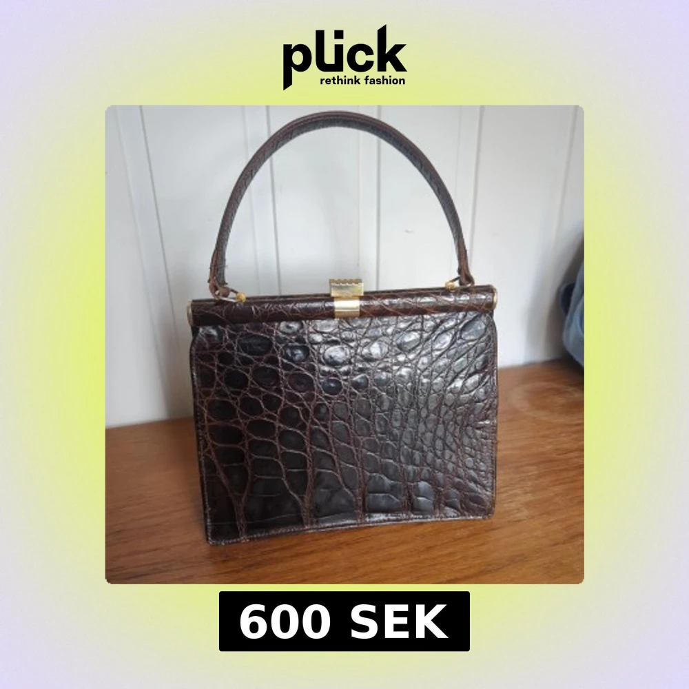 Retro, ca 1950 Elegant brun handväska med krokodilpräglat mönster och guldfärgad låsdetalj. Väskan har ett handtag och en dragkedja inuti för extra säkerhet. Perfekt för att ge en lyxig touch till din outfit.