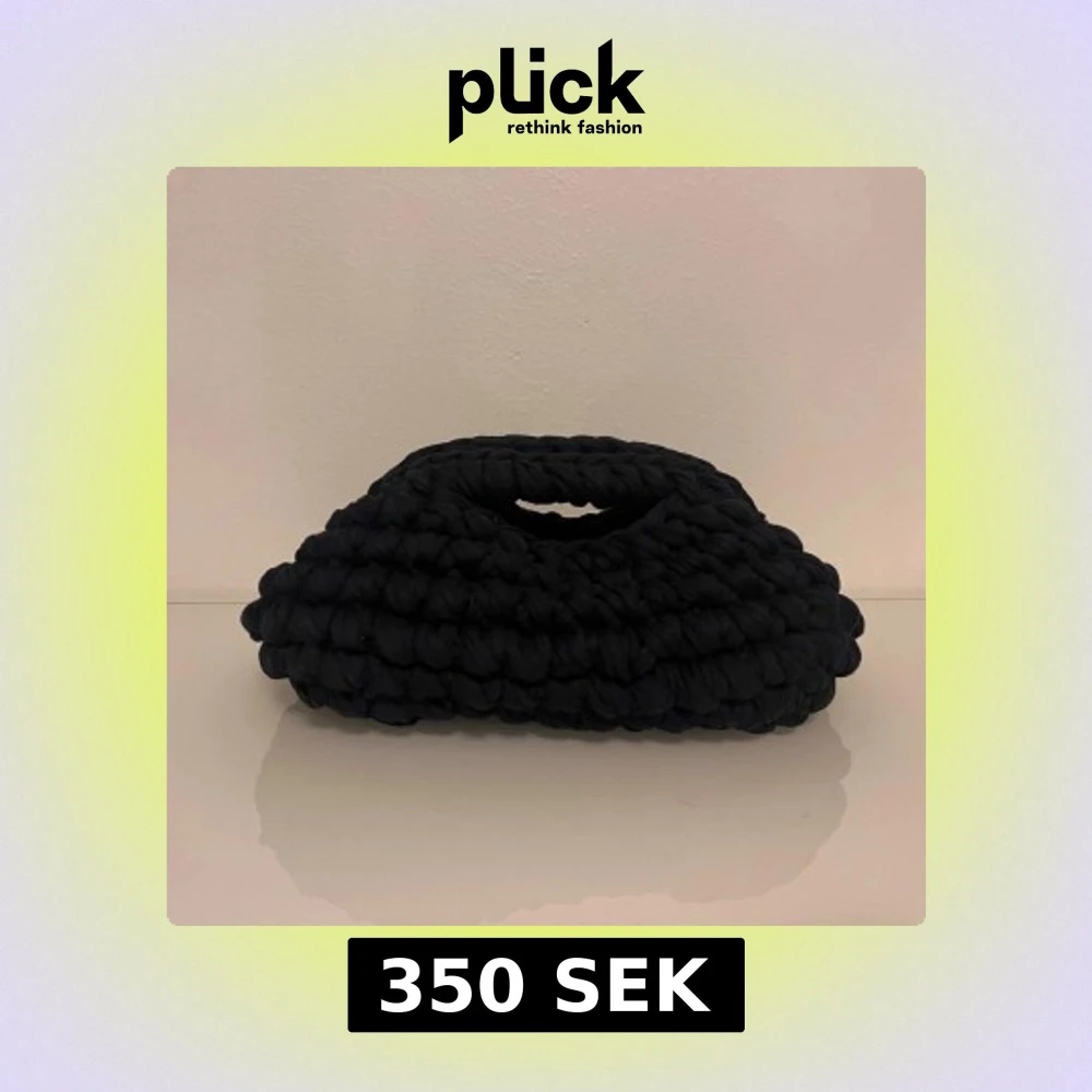 Unik svart och mörkblå handväska med chunky, stickad design och mjukt material. Väskan har ett handtag integrerat i formen och en cool, modern siluett som sticker ut. Perfekt för dig som gillar statement-accessoarer och vill ha något annorlunda.