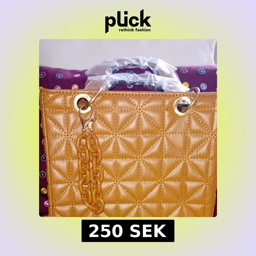 Säljer en snygg brun handväska med quiltat mönster och guldfärgade metalldetaljer. Väskan har en dekorativ kedja och är perfekt för att lyfta din outfit. Handtaget är inslaget i plast för extra skydd.