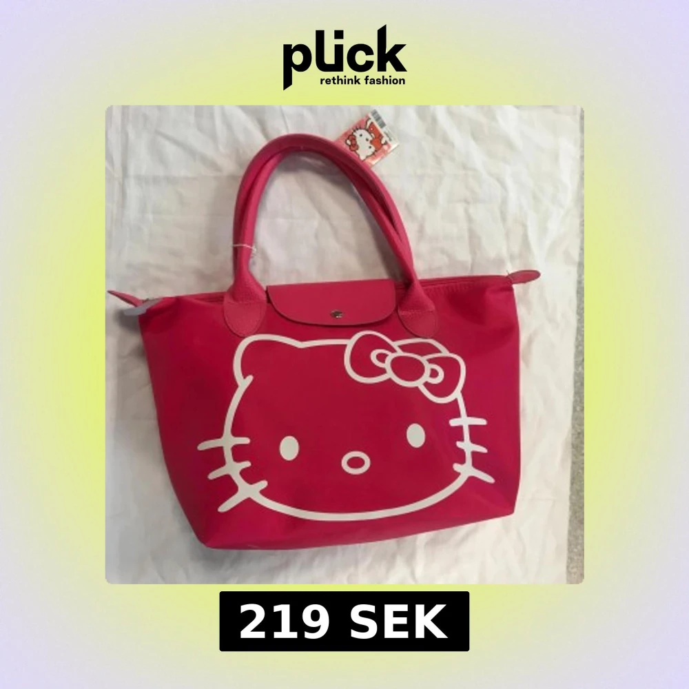 Supergullig rosa handväska från Hello Kitty med stort vitt tryck av Hello Kittys ansikte på framsidan. Väskan har två handtag, dragkedja och knappstängning upptill samt detaljer i imiterat skinn. Perfekt för dig som älskar kawaii och vill sticka ut.