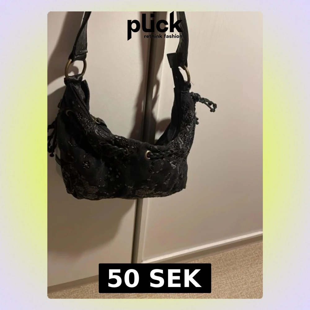 Cool svart axelväska med broderade blommor och paljettdetaljer. Väskan har snörning upptill med metallringar och flätade band, samt dekorativa tofsar på sidorna. Perfekt för dig som gillar unika accessoarer med lite extra bling.
