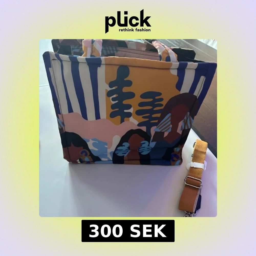 Säljer en mellan och rymlig väska med ett unikt och färgglatt mönster i blått, rosa, brunt och gult. Väskan har en praktisk dragkedja och en justerbar axelrem för bekväm användning. Perfekt för att bära med sig allt man behöver under dagen.