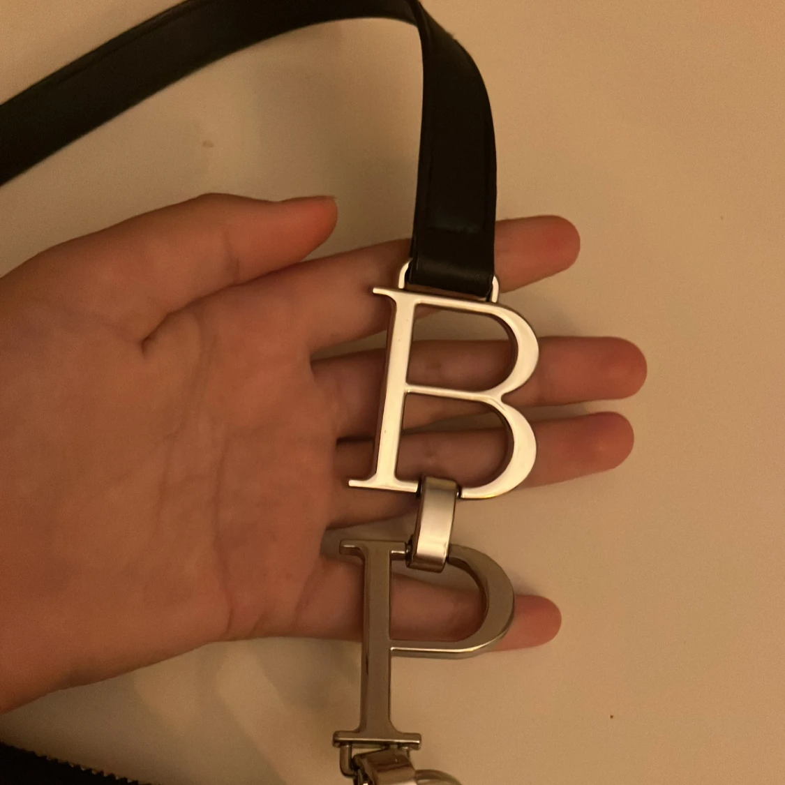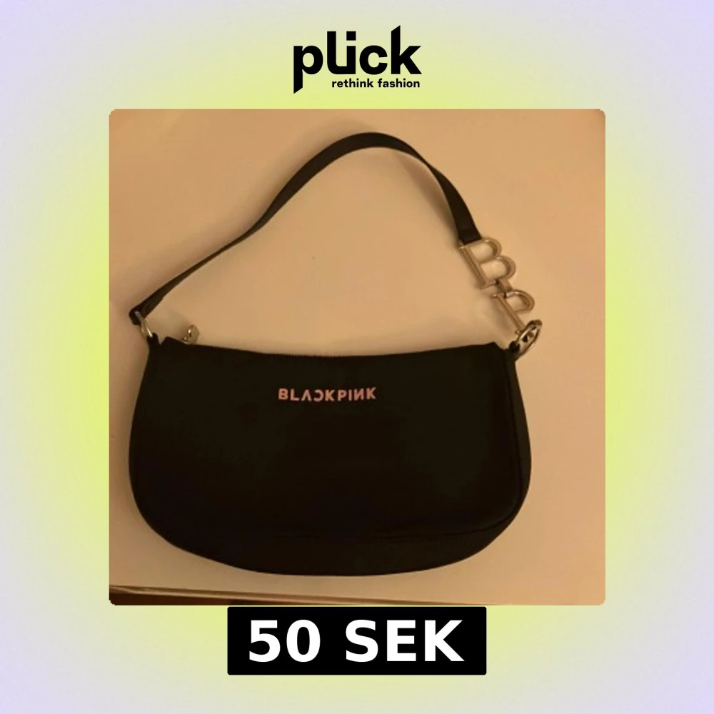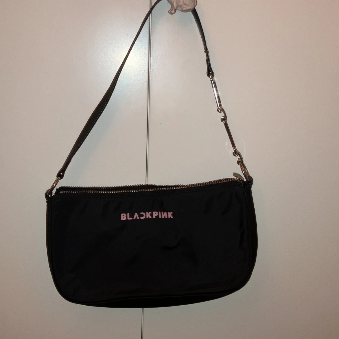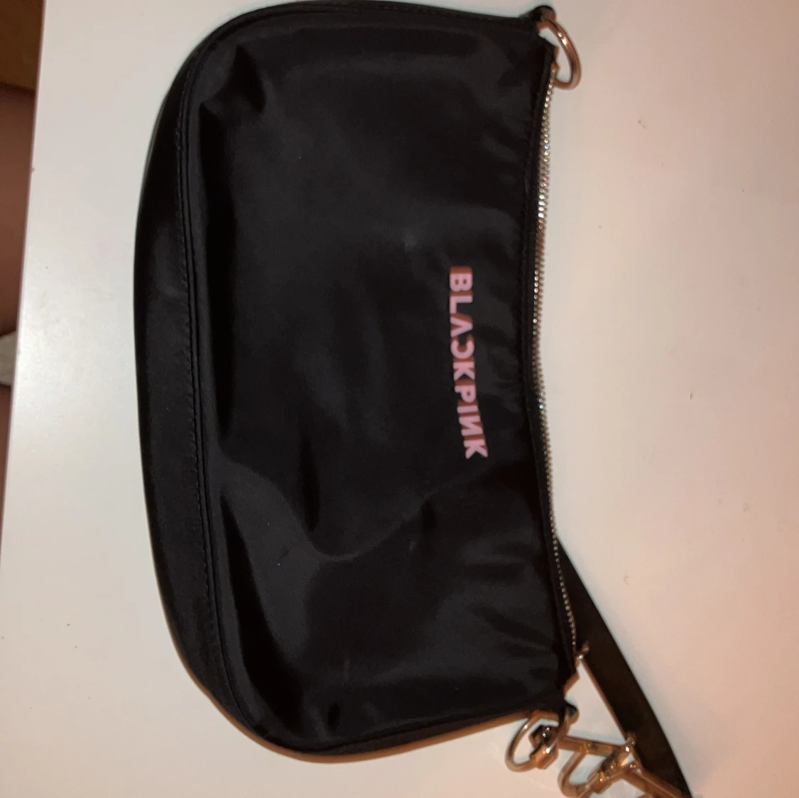 Snygg svart axelväska från BLACKPINK med rosa logga framtill. Väskan har en silvrig dragkedja och coola metallbokstäver 'B' och 'P' på axelremmen. Tillverkad i slätt syntetmaterial med svart foder. Perfekt för dig som vill sticka ut med K-pop vibes.