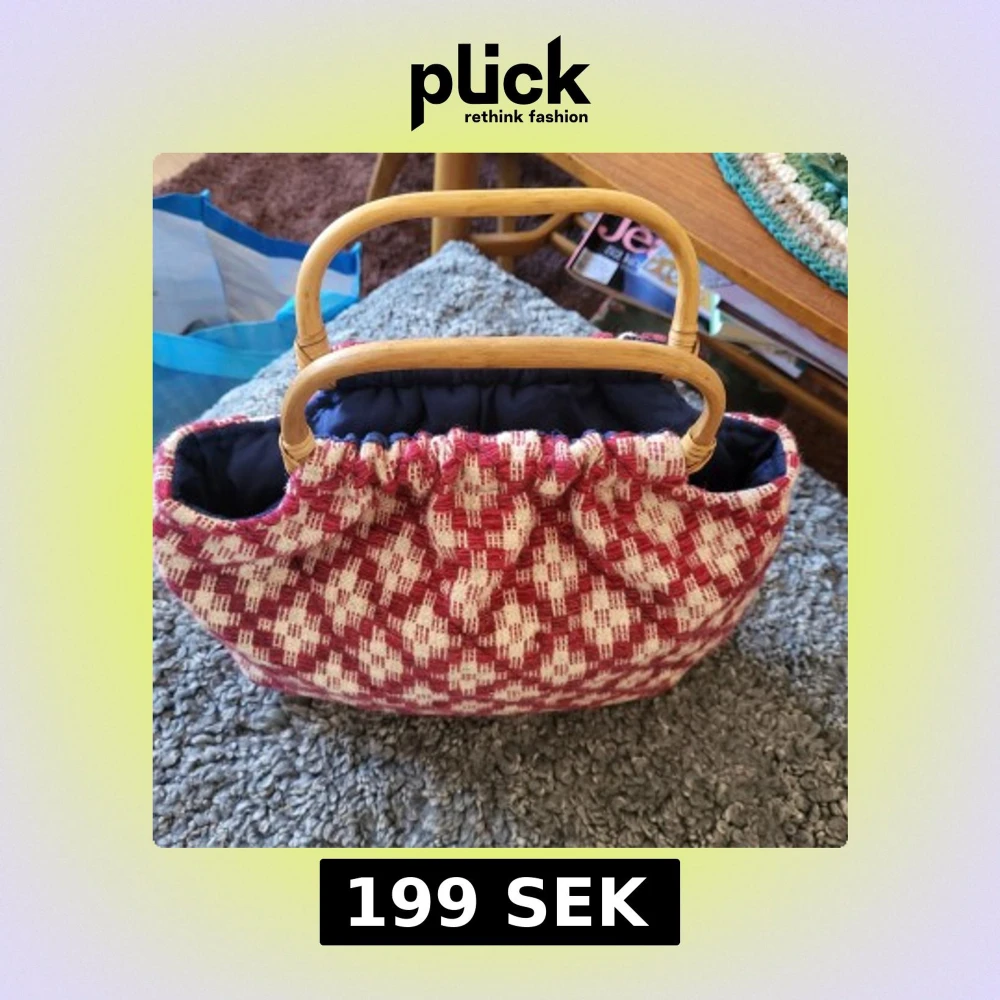 Charmig handväska med rött och vitt ulltyg rutmönster och bambuhandtag. Väskan har en mjuk, vadderad design och en mörkblå insida. Perfekt för en unik och stilfull look.