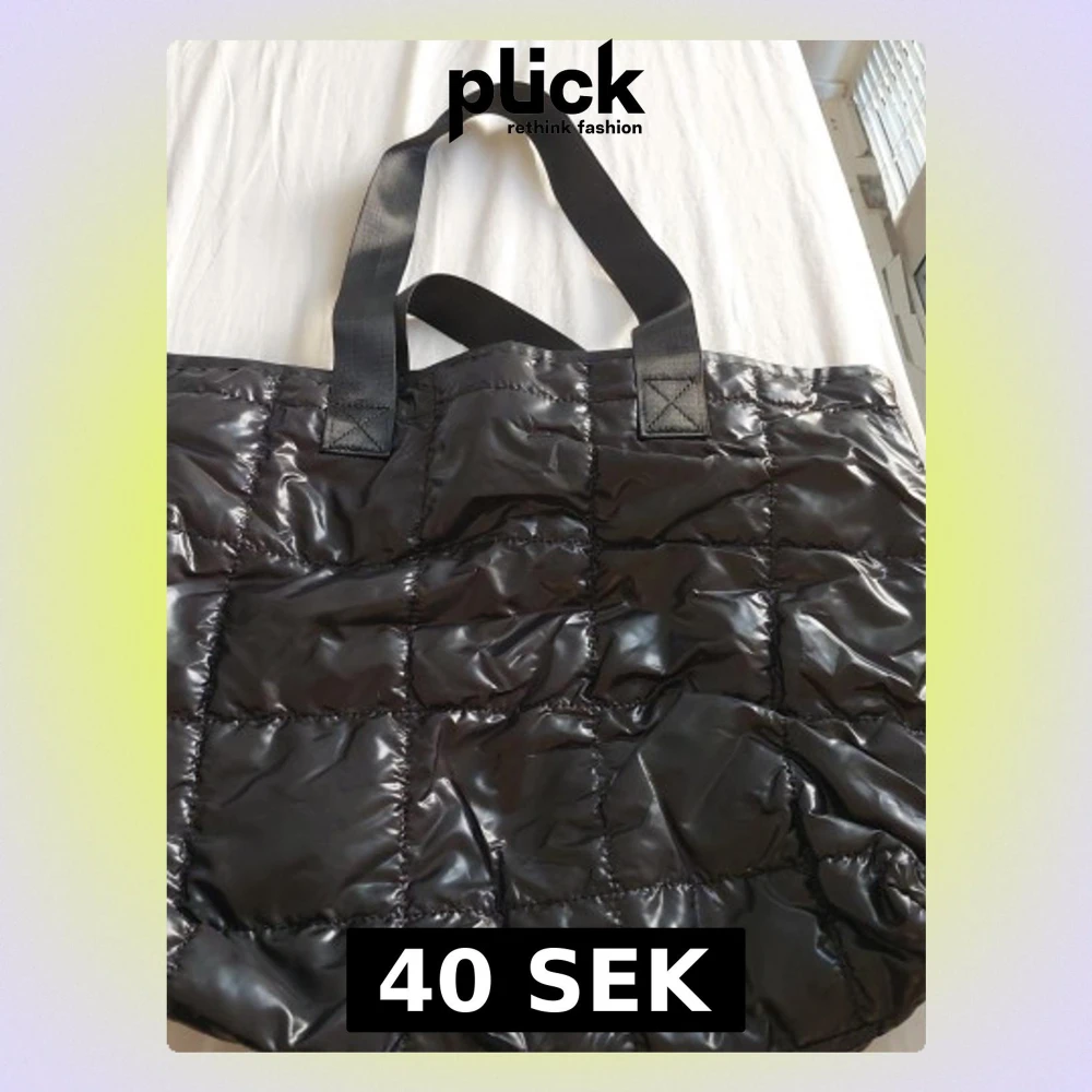 Stor och rymlig svart shoppingväska med quiltad design och blanka ytor. Väskan har breda handtag i tyg och stängs med dragkedja. Insidan har ett fack för enkel organisering av dina grejer. Perfekt för att bära med allt du behöver under dagen.