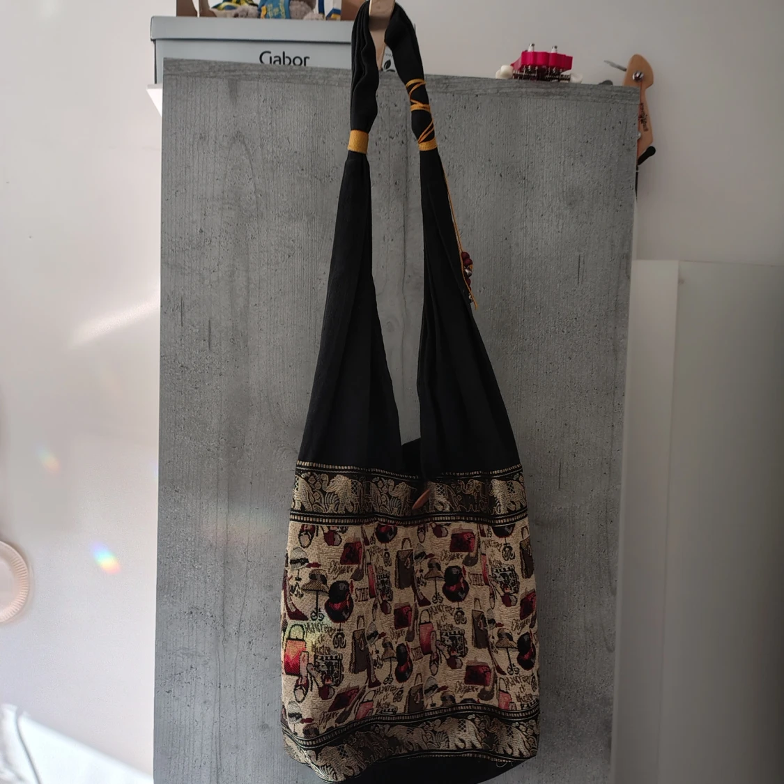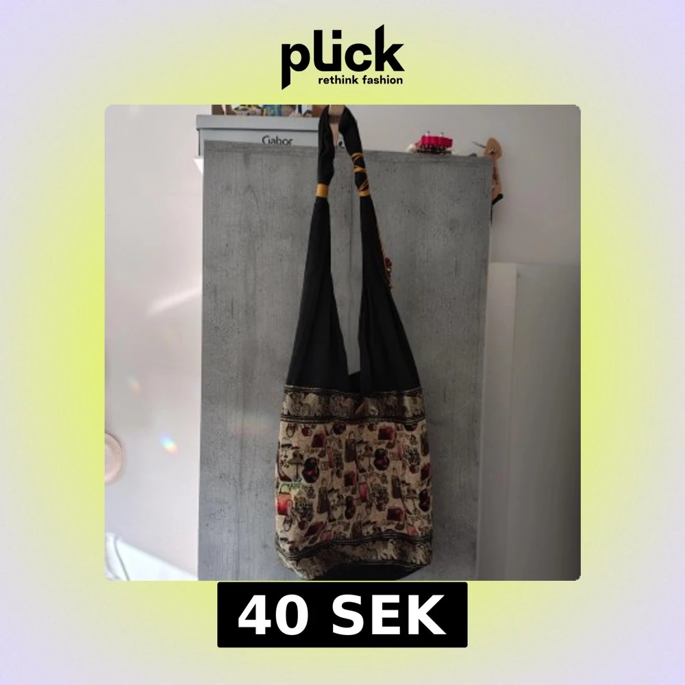 svart tygkasse med mönster samt bjällror, PM för frågor å fler bilder