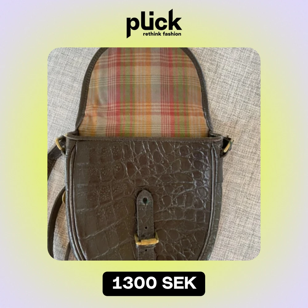 Säljer en snygg brun vintage (80-tal) axelväska från Mulberry. Väskan är gjord av skinn med en krokodilpräglad yta och har ett klassiskt rutigt foder i grönt, rött och orange. Den har en justerbar axelrem och ett spänne framtill. Insidan har en dragkedjeficka för extra förvaring. Perfekt för både vardag och fest!